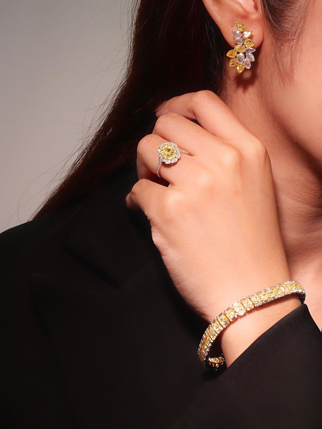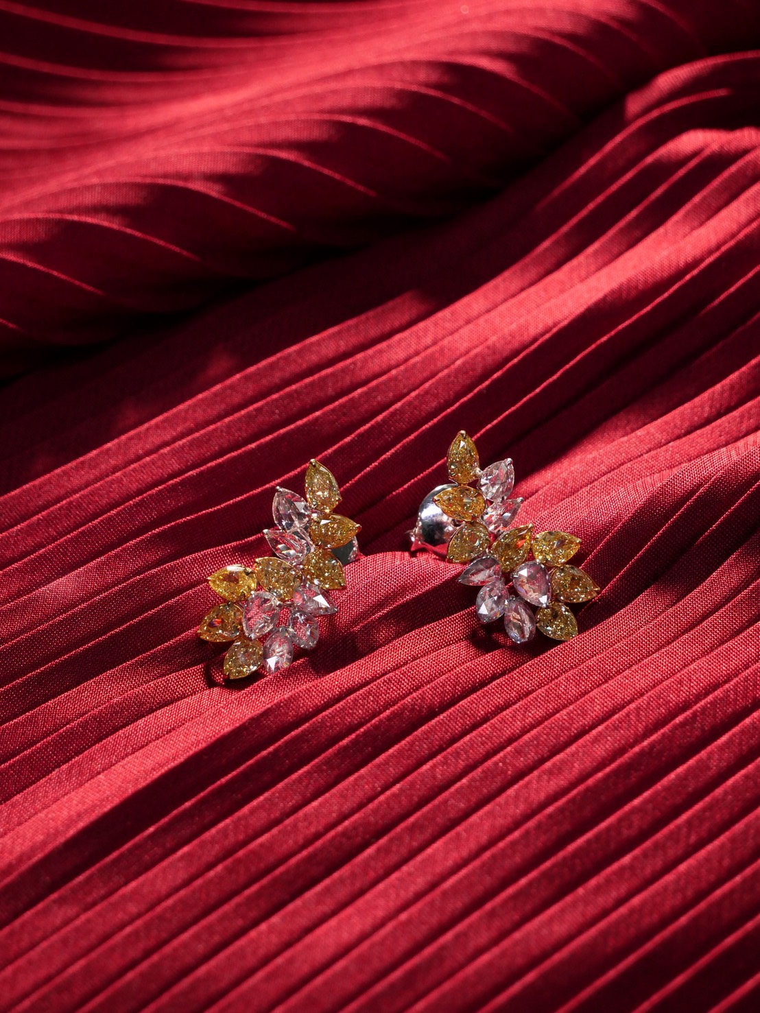 ต่างหูเพชร Pear 14 / 4.71 ct Fancy Vivid Yellow ความสะอาด VVS VS Pear 8 / 1.13 ct สี E ความสะอาด VVS VS Marquise 4 / 0.57 ct สี E ความสะอาด VVS VS GIL