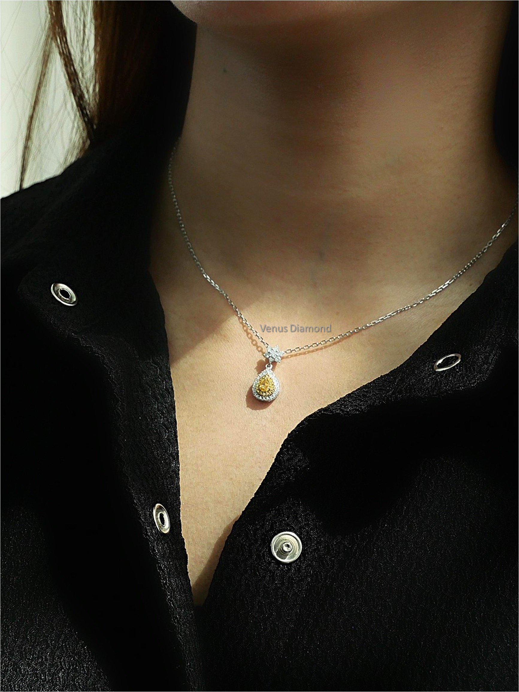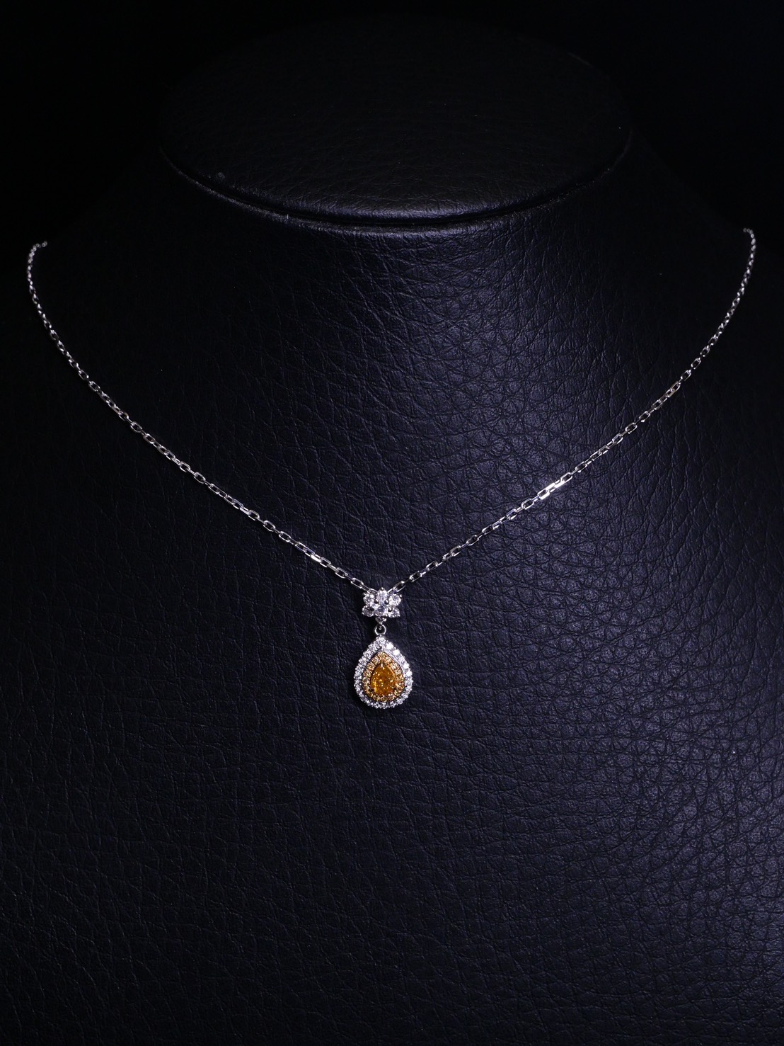 สร้อยคอเพชร Pear 0.21 ct Fancy Intense Orangy Yellow SI1 2G STY GIA 6223591190 Round 0.29 ct white gold 18k. 3.48 g.