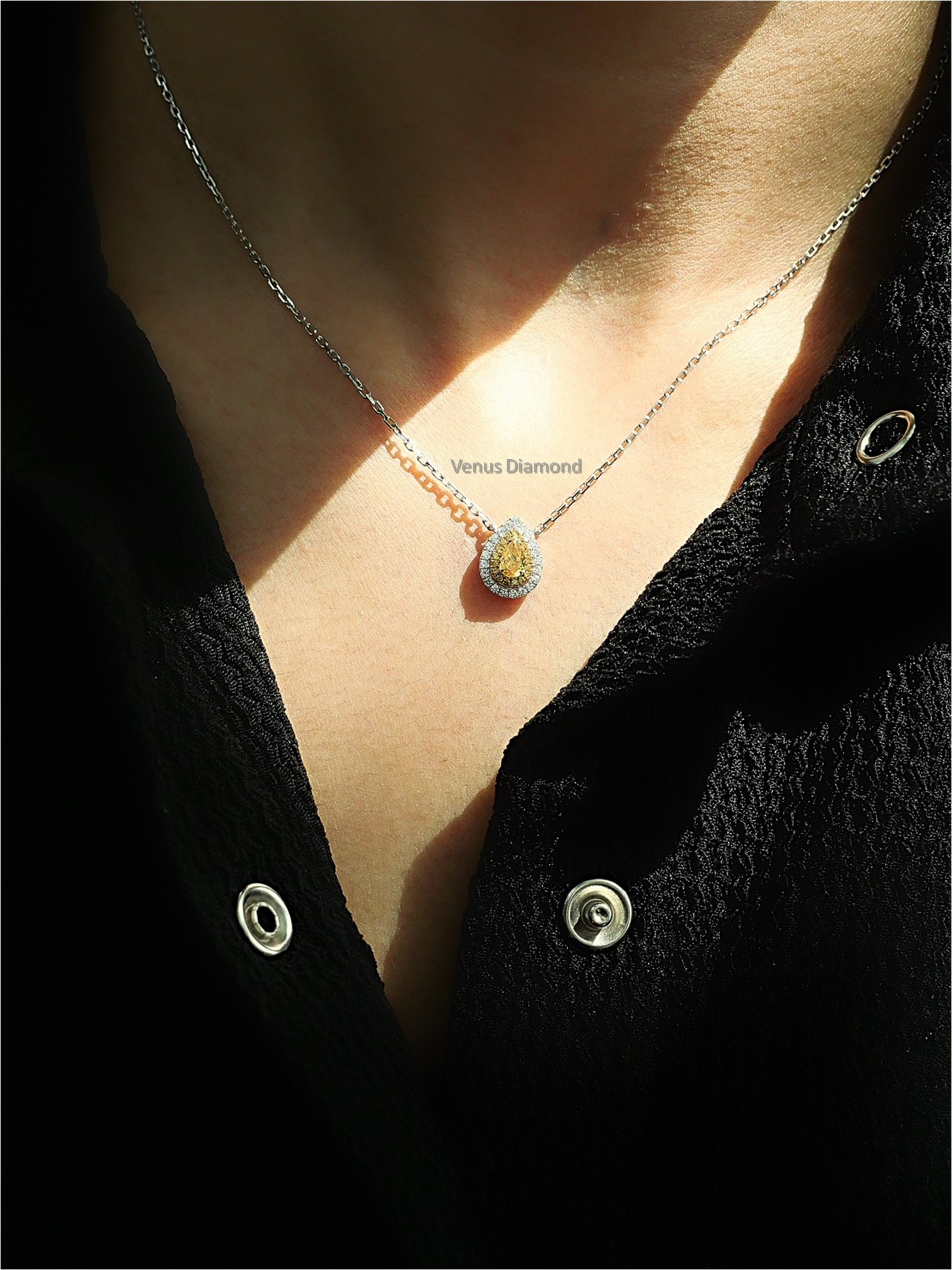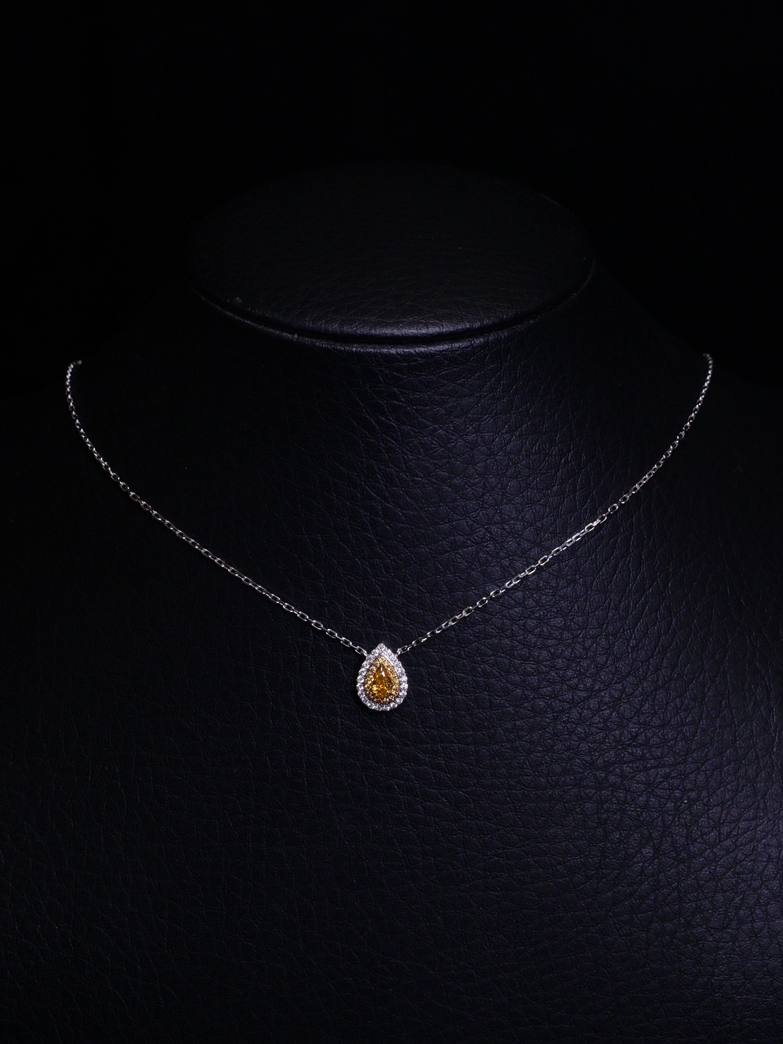 สร้อยคอเพชร Pear 0.24 ct Fancy Vivid Orangy Yellow I1 2G N ใบเซอร์ GIA 6223591202 Round 0.17 ct white gold 18k. 2.99 g.