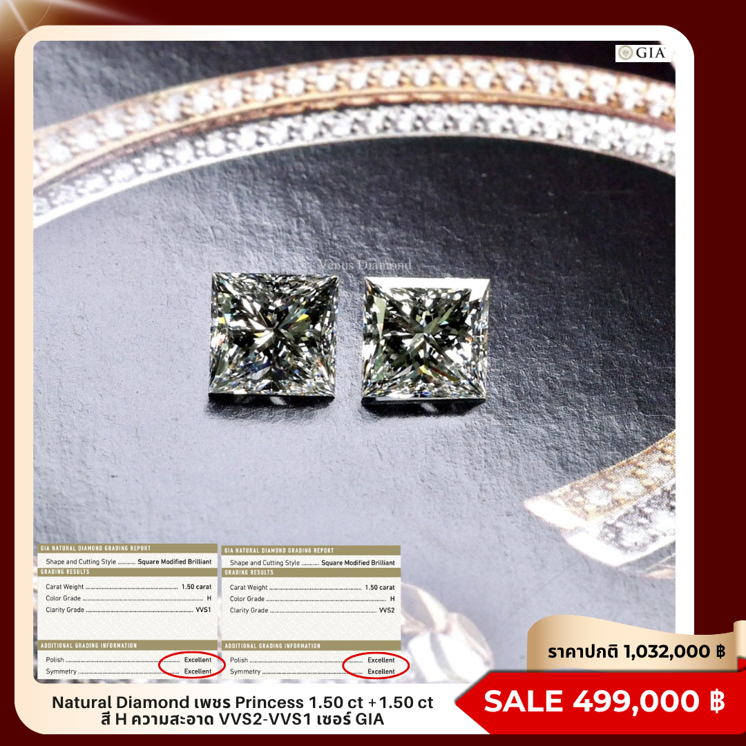- Princess 1.50 ct สี H ความสะอาด VVS2 2X N GIA 6425554522 - Princess 1.50 ct สี H ความสะอาด VVS1 2X N GIA 2225311326