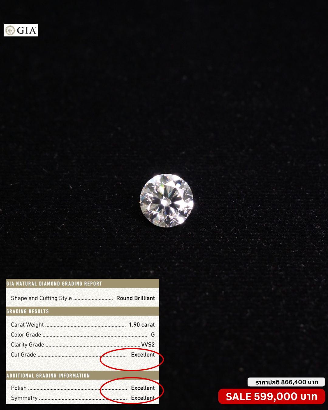 เพชร Round 1.90 ct สี G เพชรสะอาด VVS2