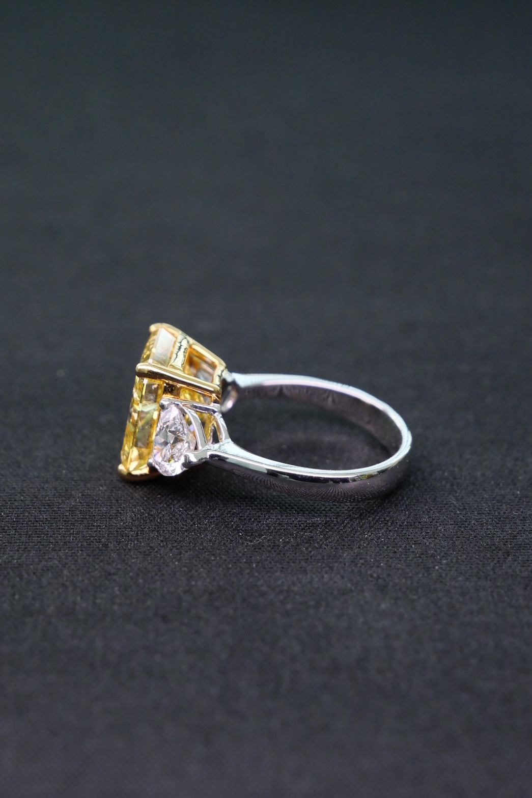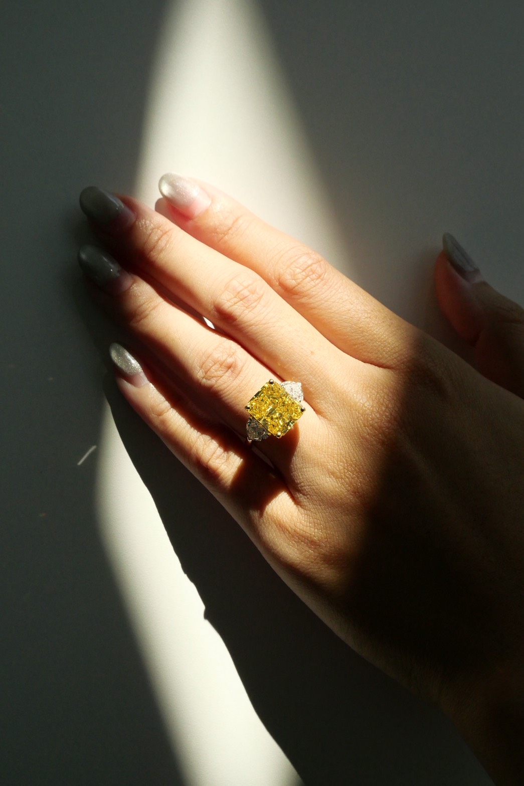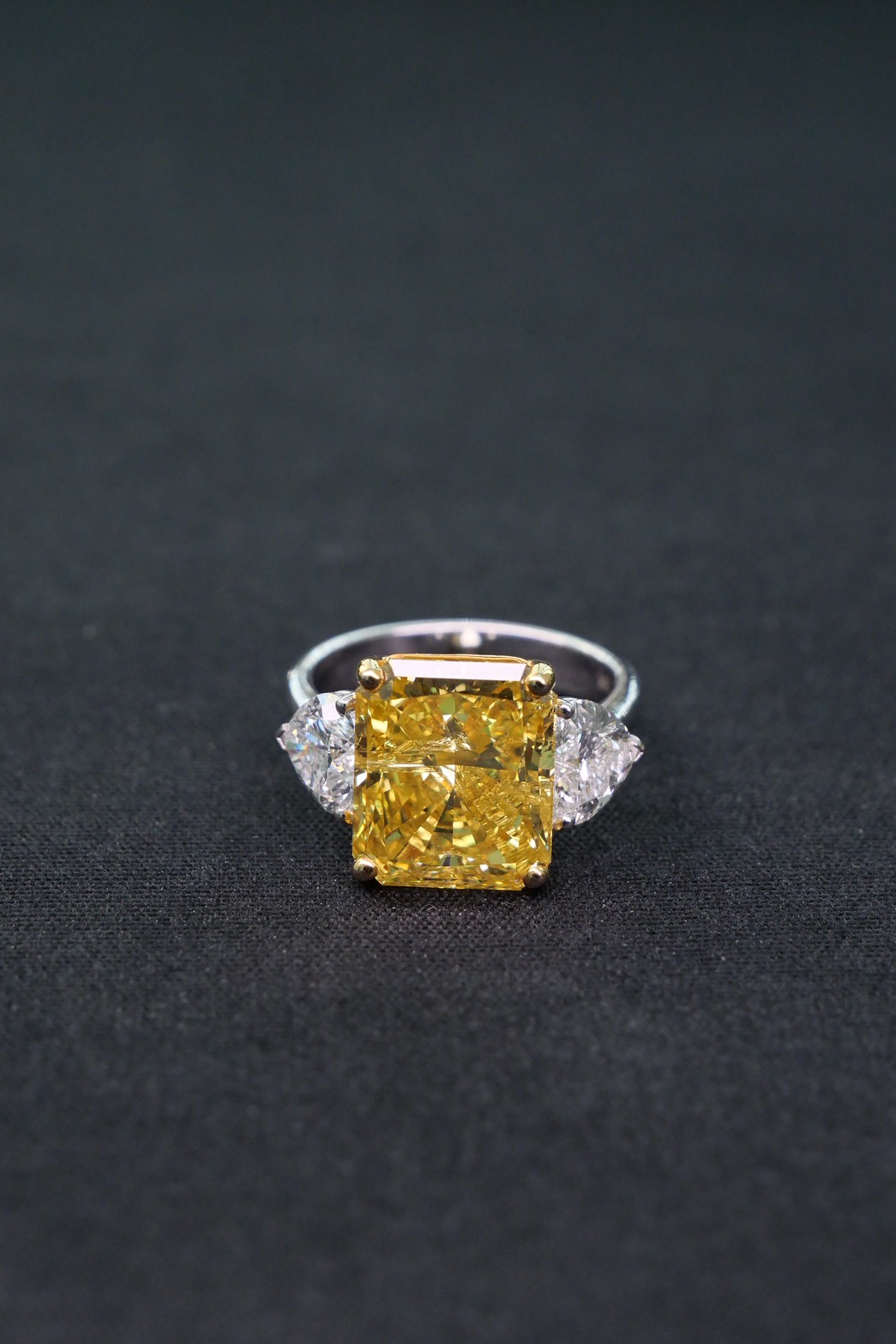 Radiant 6.71 ct Fancy vivid yellow ใบเซอร์ GIA 5212441674 Heart 2 pcs 0.70 ct สี E F น้ำ 99-98 ความสะอาด VVS VS