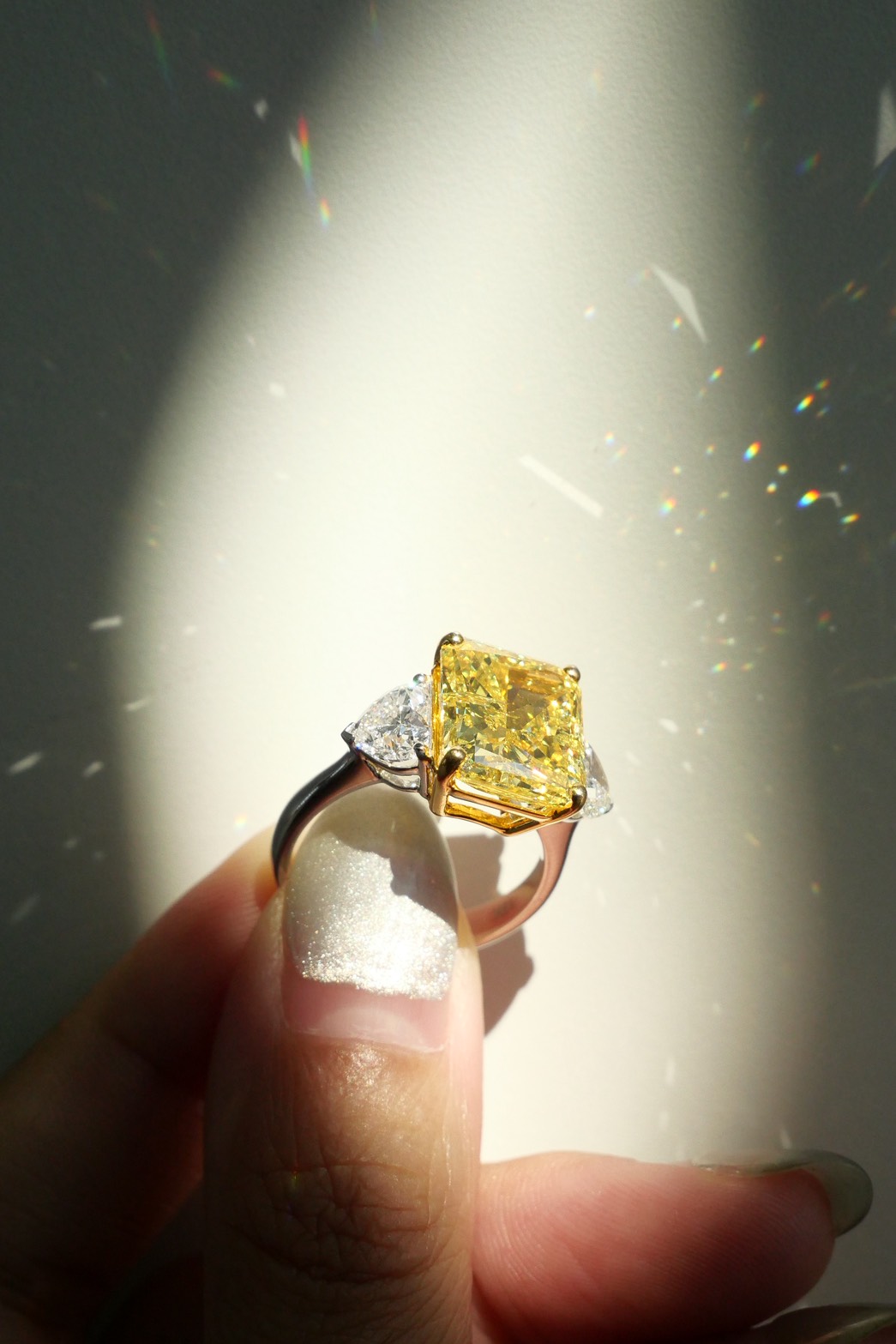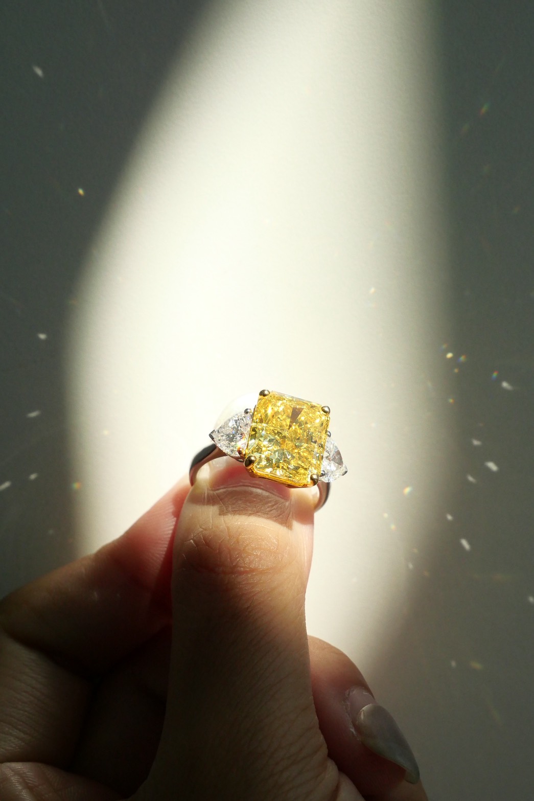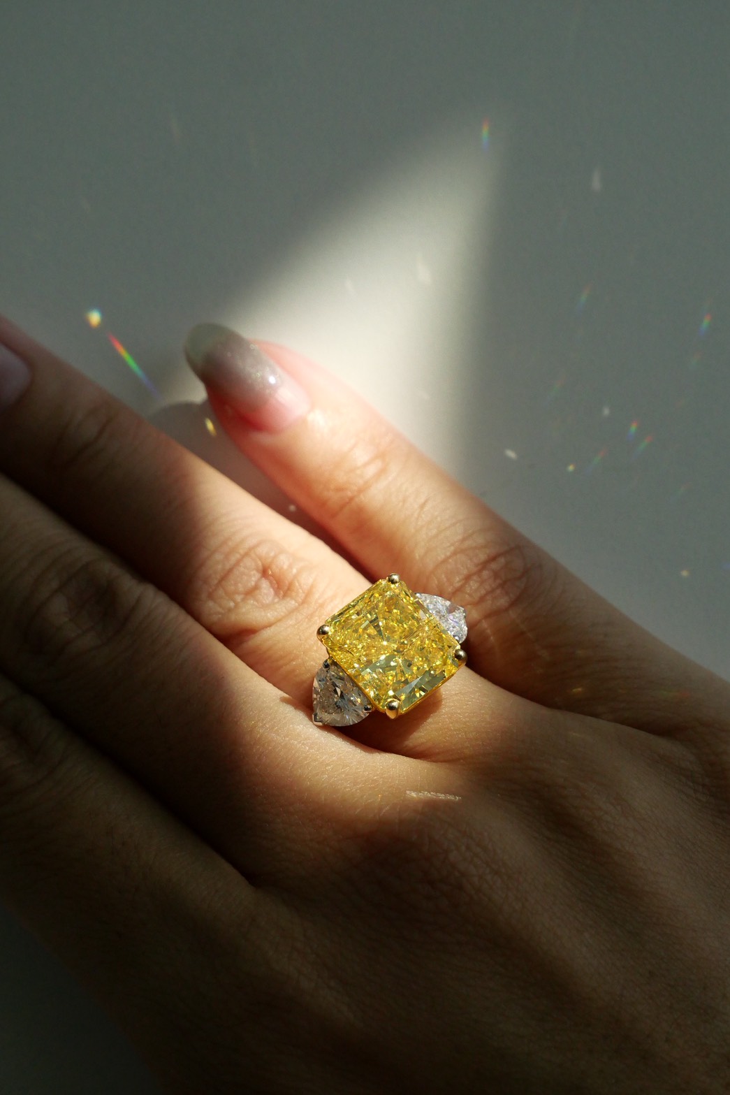 Radiant 6.71 ct Fancy vivid yellow ใบเซอร์ GIA 5212441674 Heart 2 pcs 0.70 ct สี E F น้ำ 99-98 ความสะอาด VVS VS