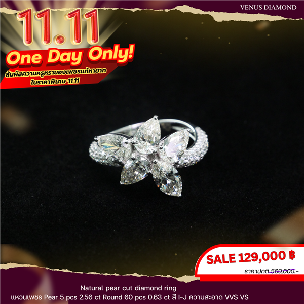 แหวนเพชร Pear 5 pcs 2.56 ct Round 60 pcs 0.63 ct สี I-J ความสะอาด VVS VS ใบเซอร์ HKD