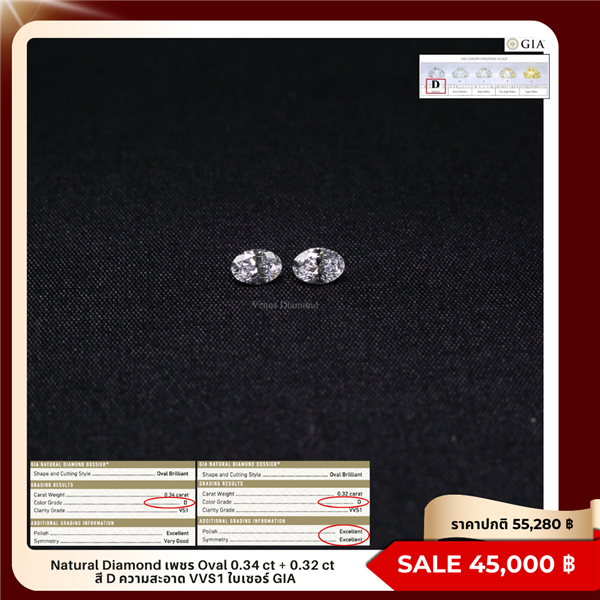 เพชร Oval 0.34 ct +0.32 ct สี D ความสะอาด VS1 VVS1 ใบเซอร์ GIA