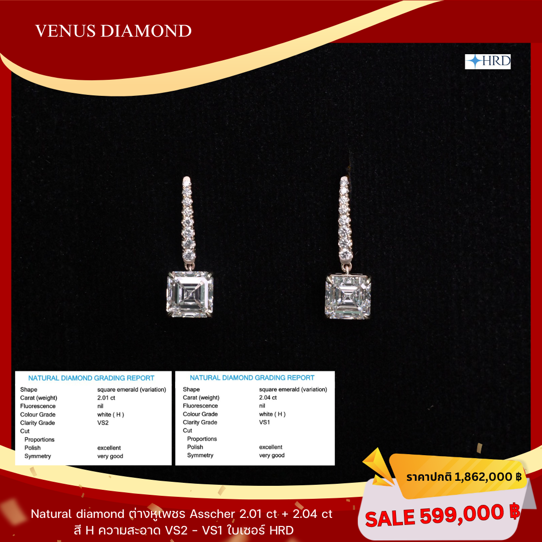 💎✨ Rare Natural Asscher Cut Diamond Drop Earrings - ต่างหูเพชรแท้ทรง Asscher Cut เม็ดโตๆ น้ำหนักเพชร ฟาดไป 2.01 + 2.04 กะรัต