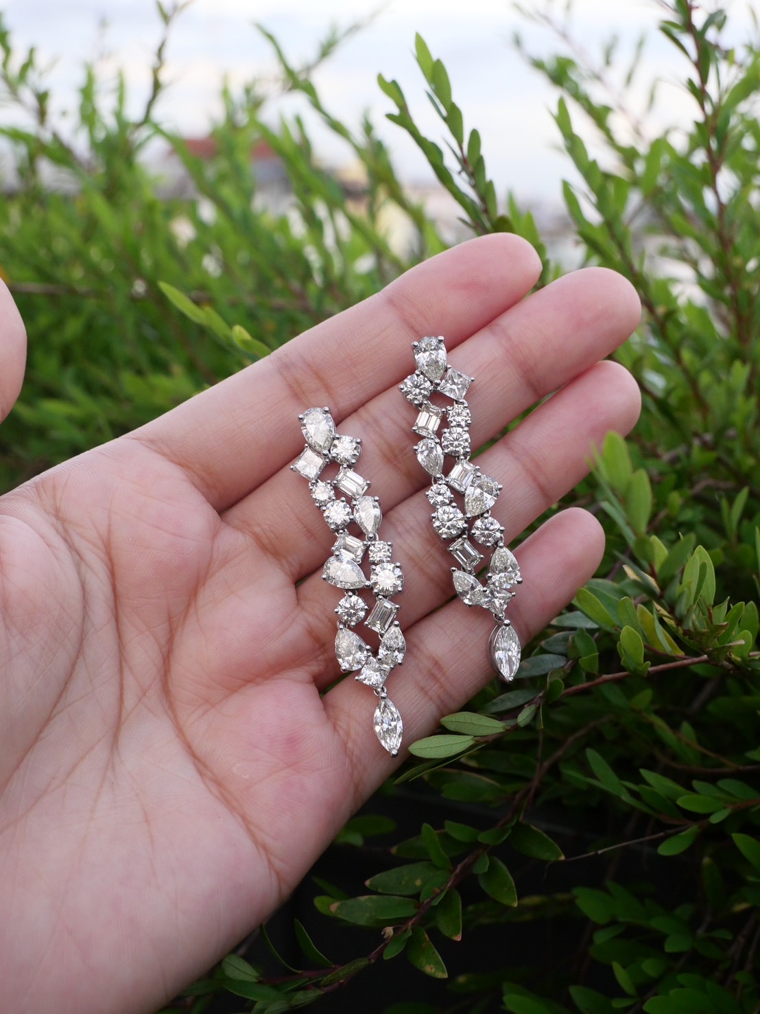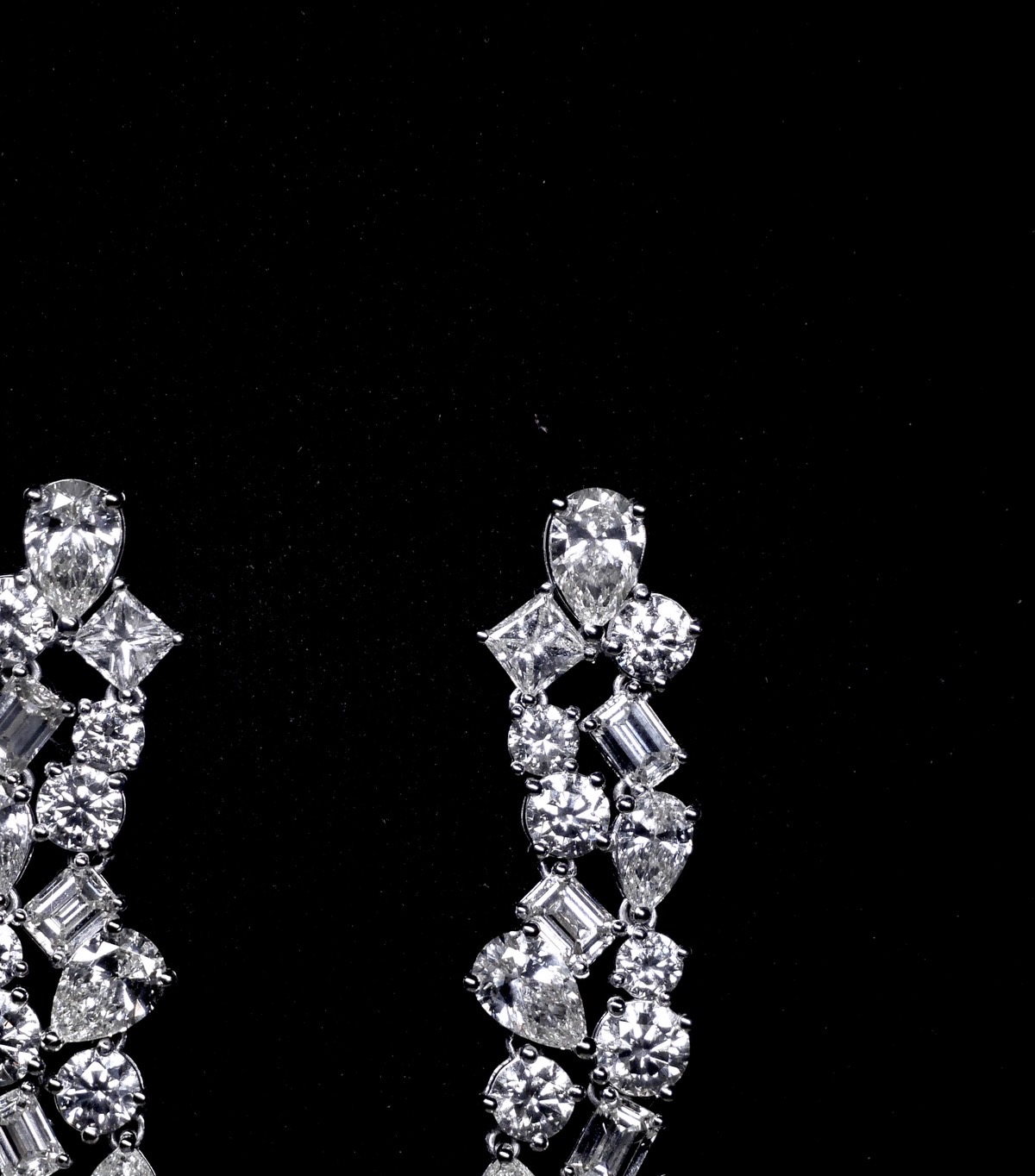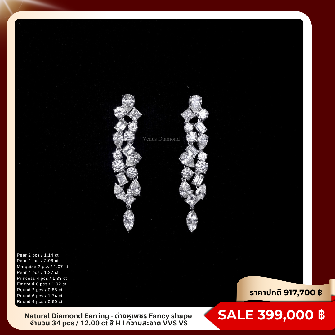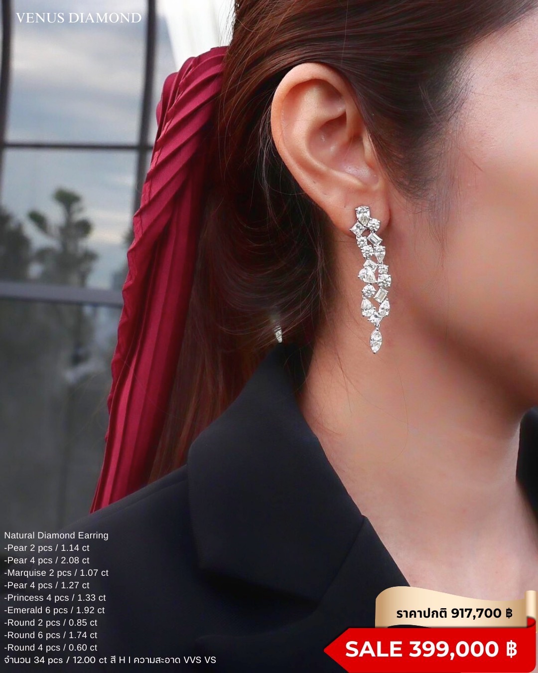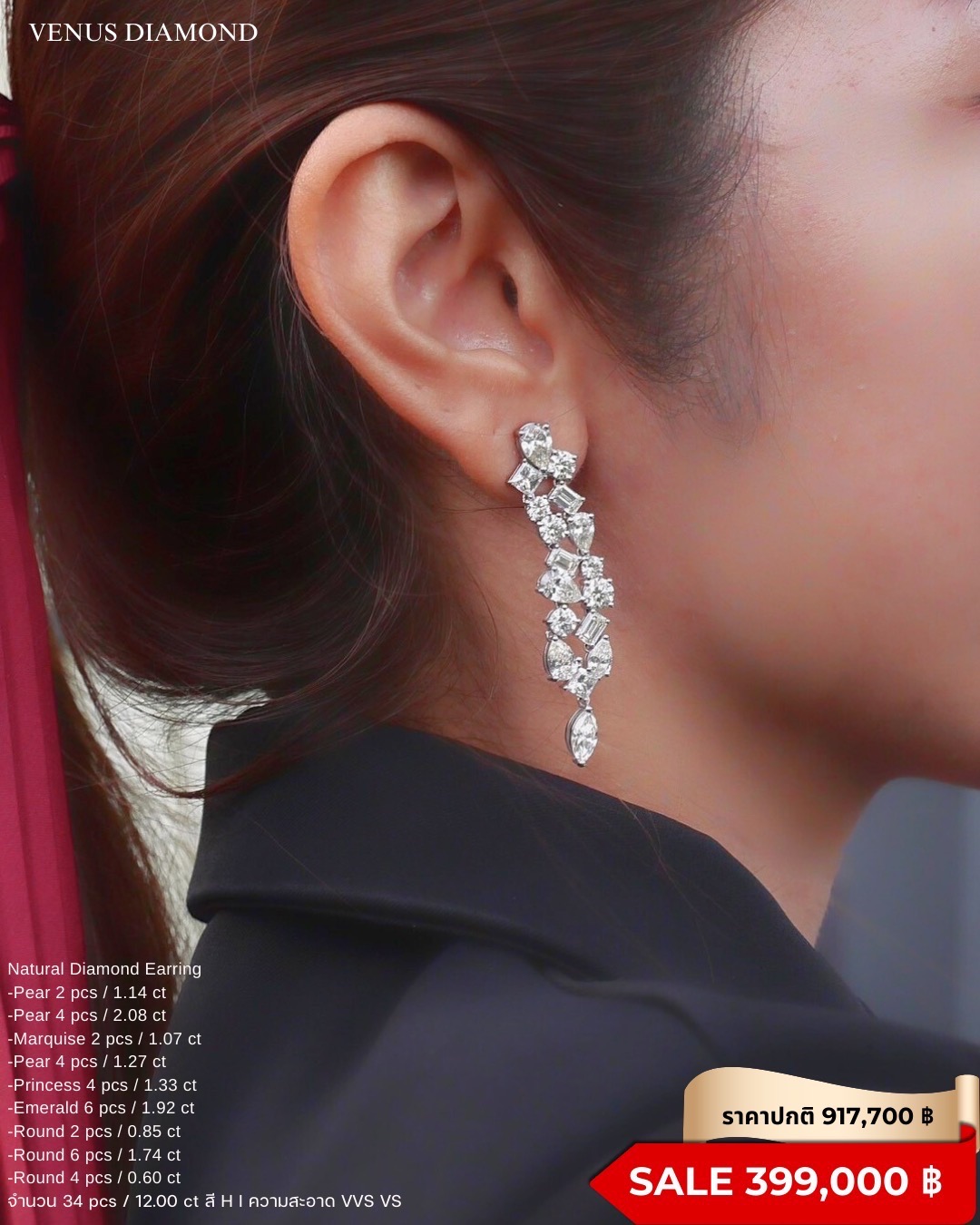 ต่างหูเพชร สี H I ความสะอาด VVS VS Pear 2/1.14 ct Pear 4/2.08 ct Marquise 2/1.07 ct Pear 4/1.27 ct Princess 4/1.33 ct Emerald 6/1.92 ct Round 2/0.85 ct Round 6/1.74 ct Round 4/0.60 ct Total 34/12.00 ct white gold 18 k. 13.75 g