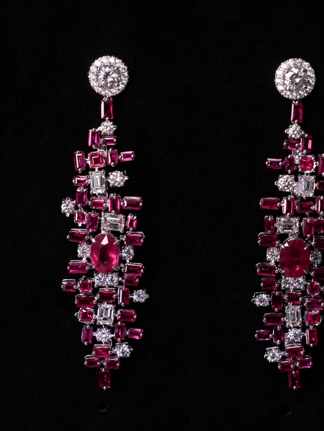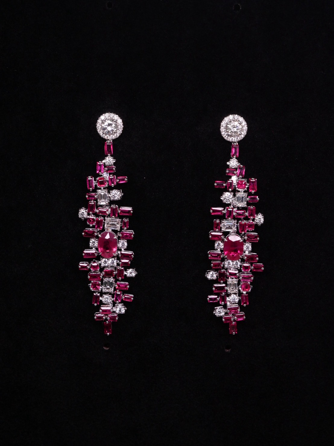 ต่างหู Ruby 2 pcs 1.99 ct Ruby Fancy 68 pcs 4.49 ct Emerald 6 pcs 1.11 ct Round 2 pcs 0.51 ct Round 48 pcs 0.84 ct สี F G ความสะอาด VVS white gold 18k. 14.42 g.