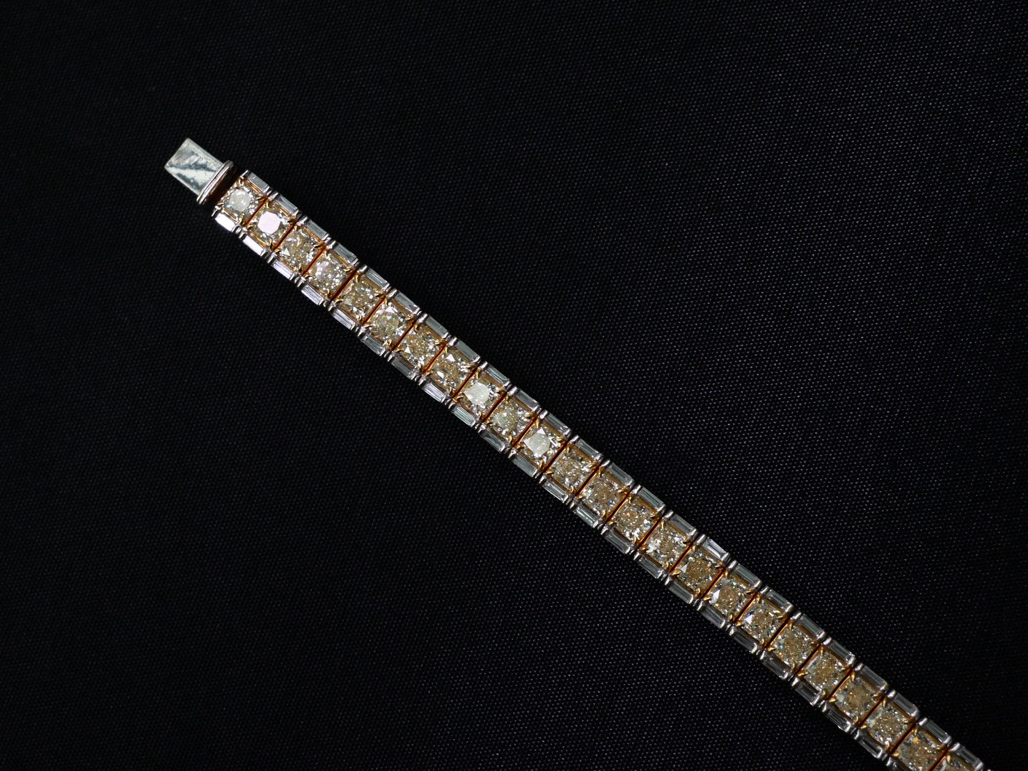 สร้อยข้อมือเพชร Radiant 40 pcs 12.02 ct Fancy Yellow GIL Baguette 80 pcs 1.88 ct สี E ความสะอาด VVS VS GIL