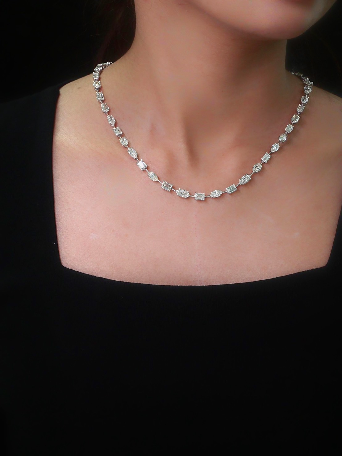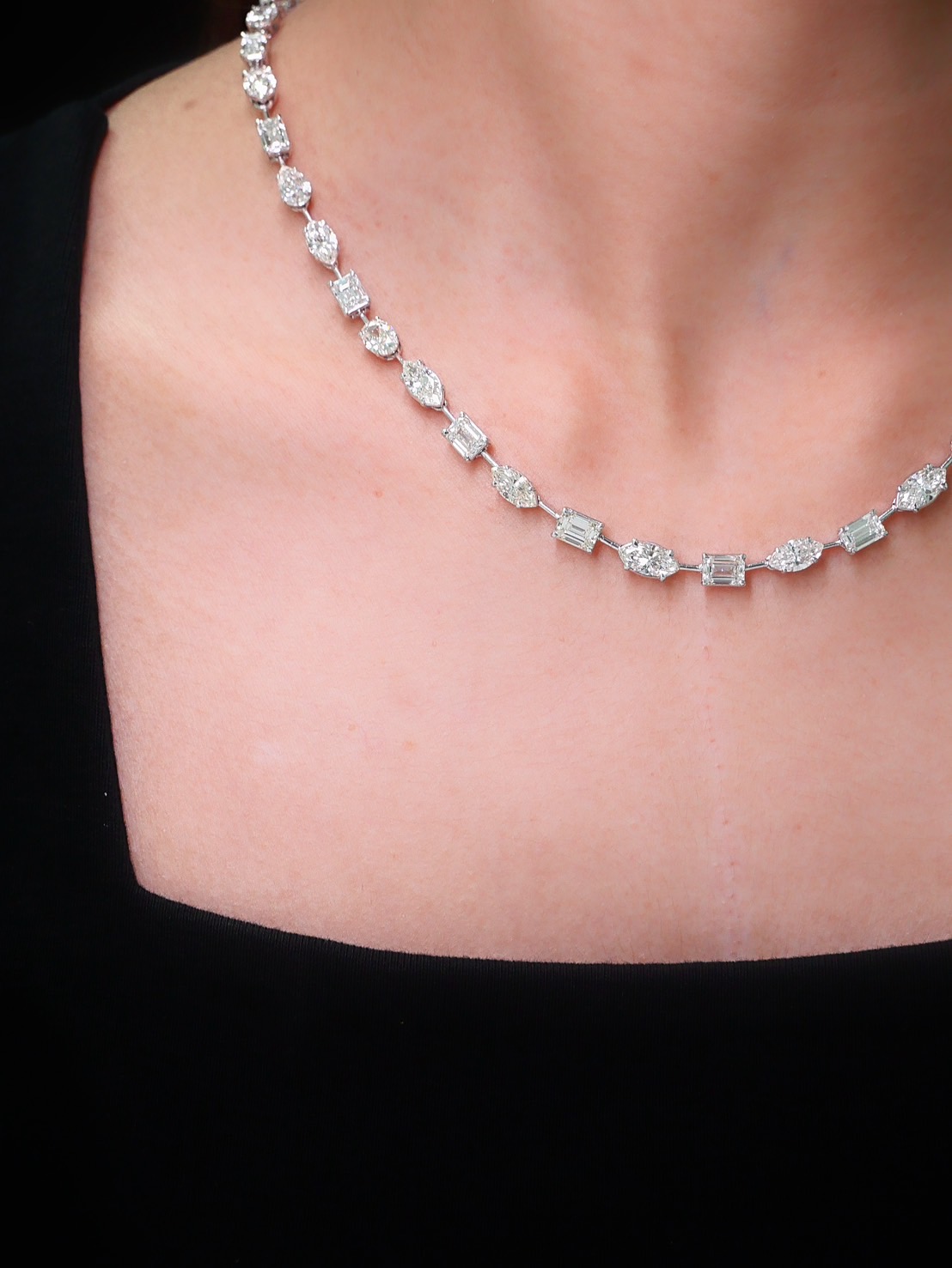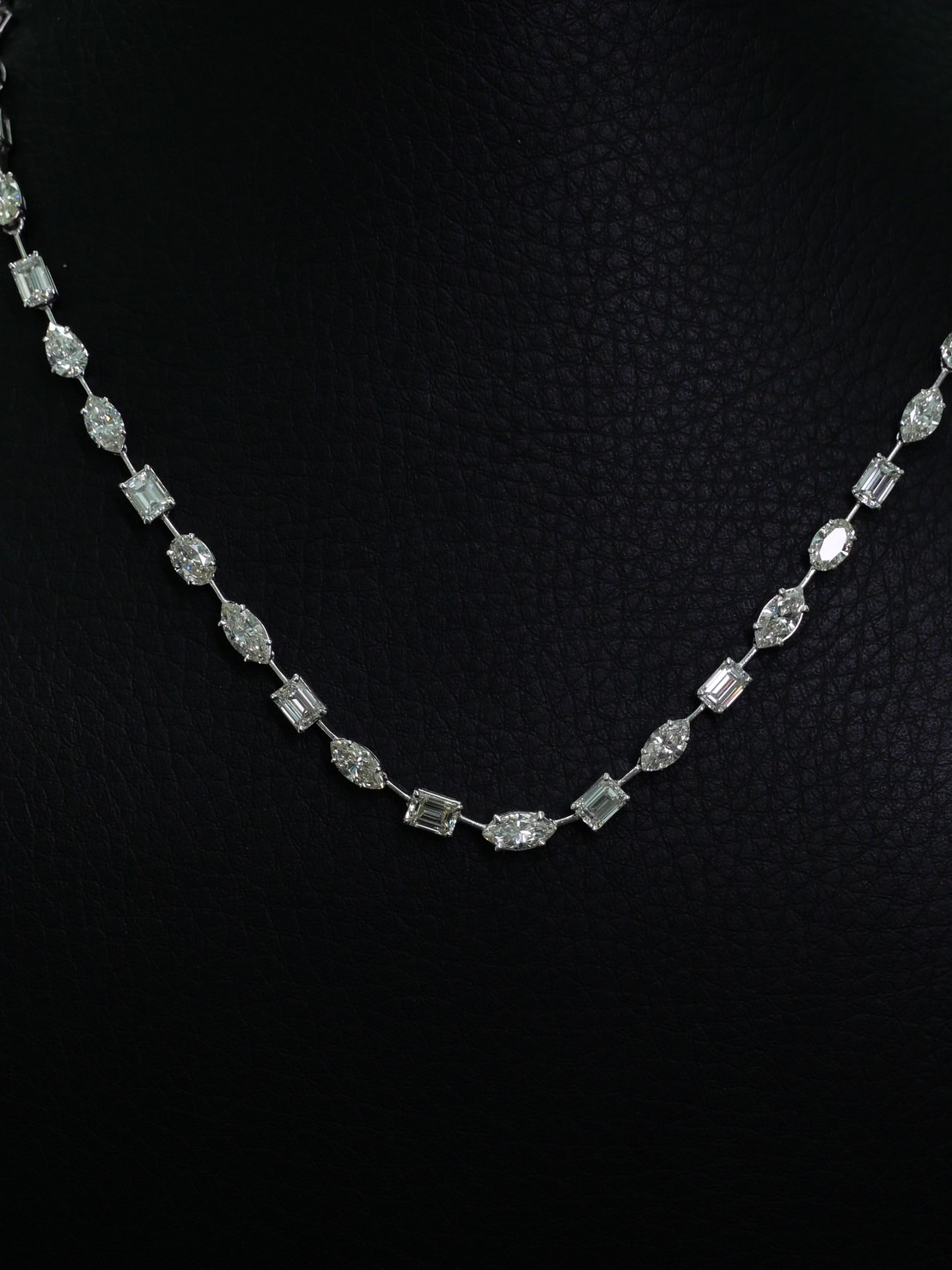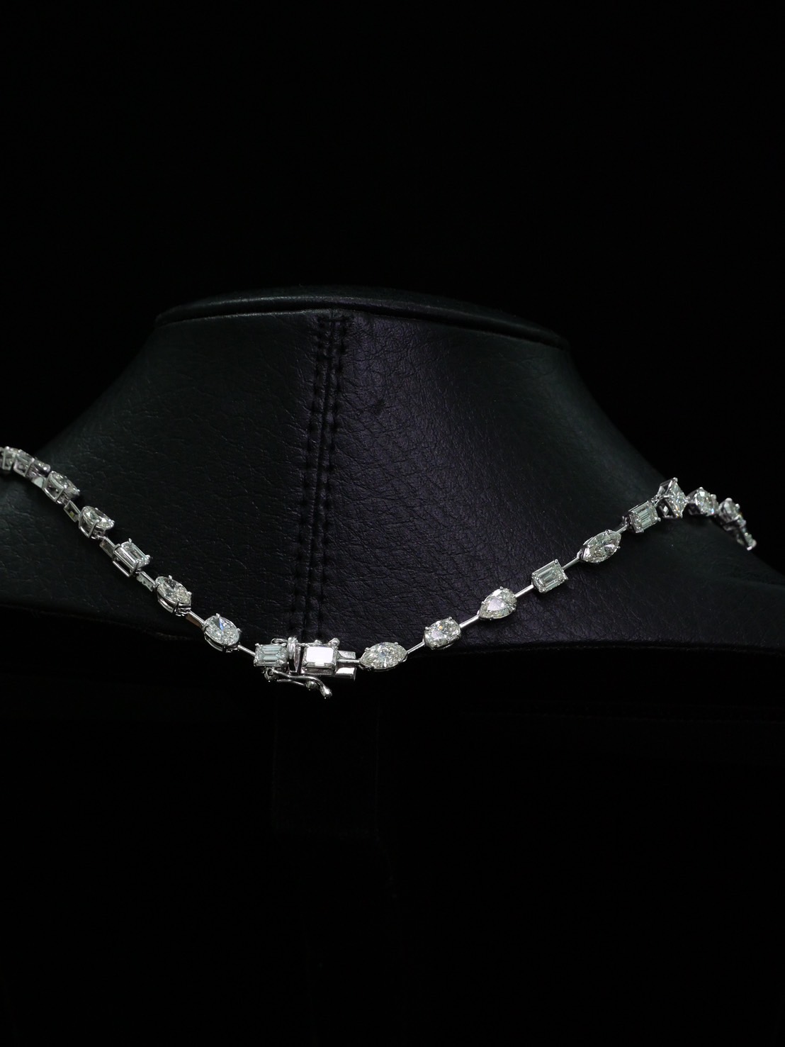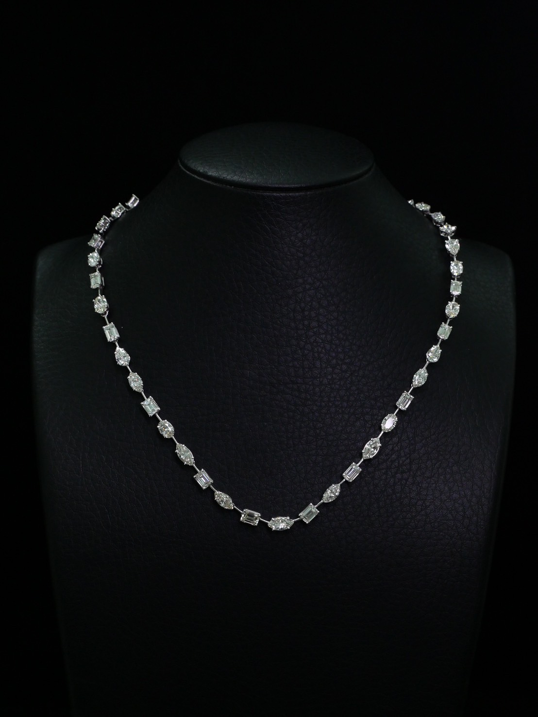 สร้อยคอ Fancy shape 47 pcs 21.65 ct สี F G ความสะอาด VVS VS Pear 3/1.65 ct Oval 6/3.08ct Emerald 10/5.24 ct Marquise 7/3.67ct Princess 1/0.50 ct