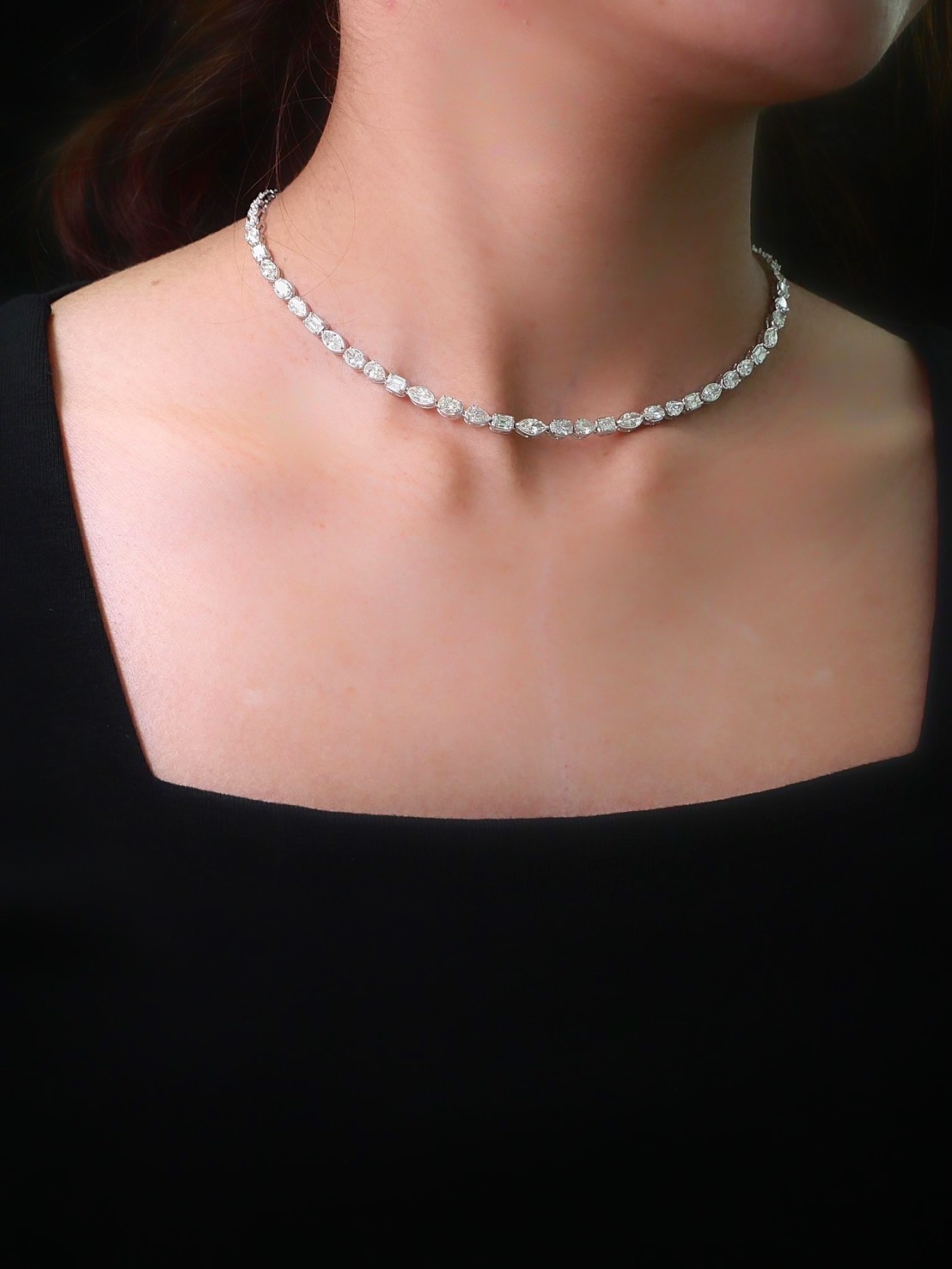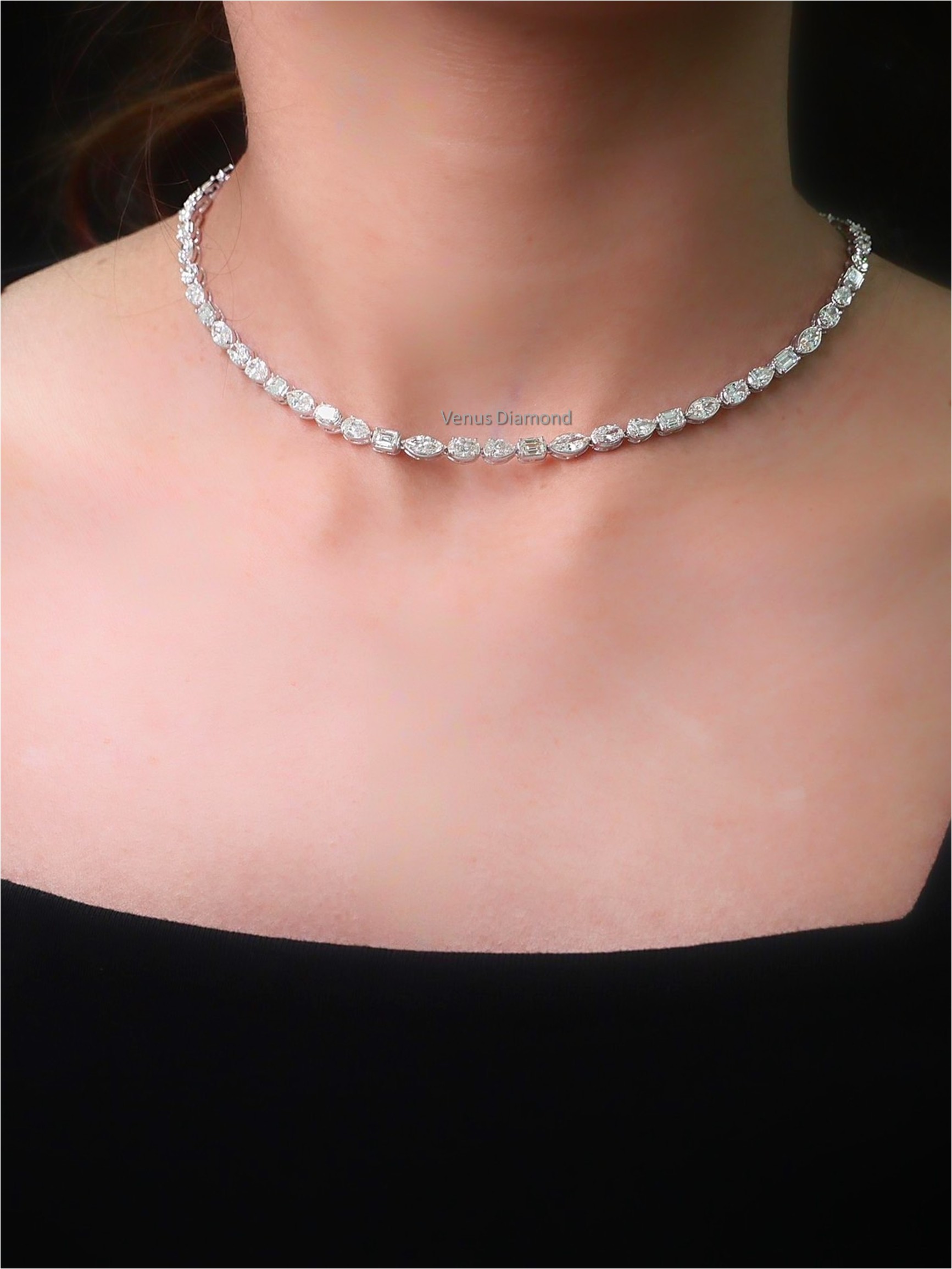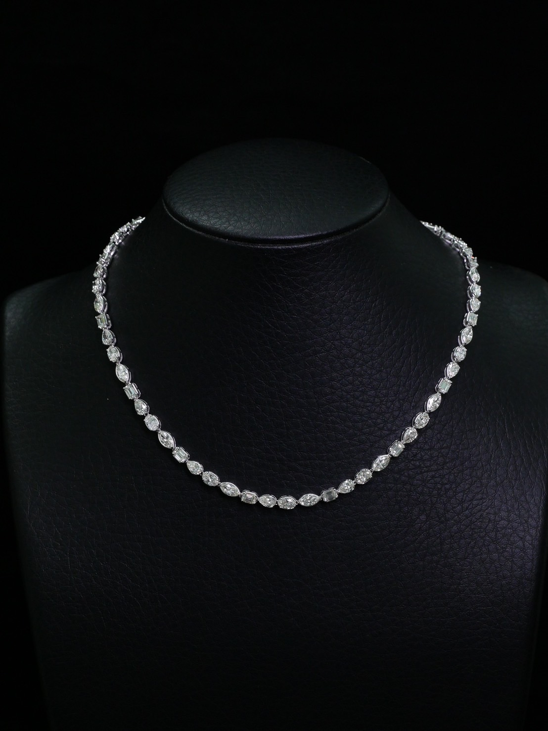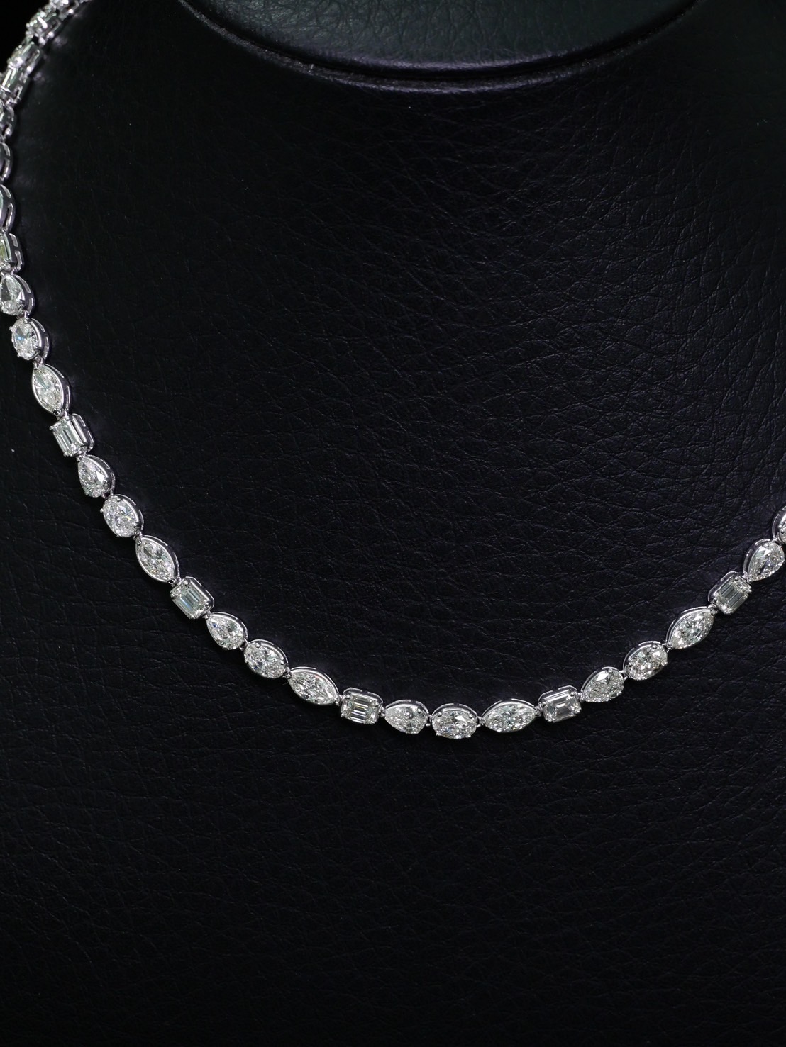 สร้อยคอเพชร Pear Marquise Oval Emerald Pear 2.98 ct / 15 pcs Marquise 3.38 ct / 16 pcs Oval 2.98 ct / 16 pcs Emerald 2.81 ct / 15 pcs Total 12.15 ct / 62 pcs สี F VVS VS white gold 19.12 g HKD 2025060510312DJTH