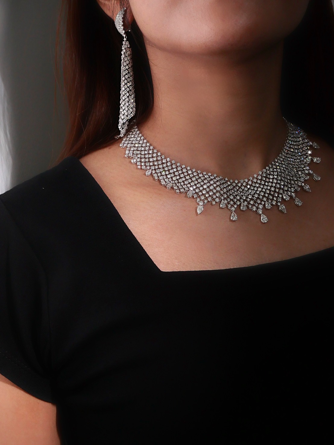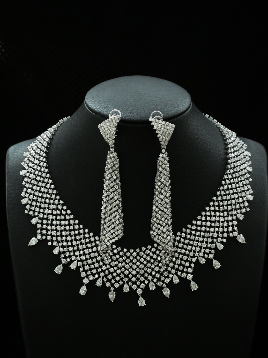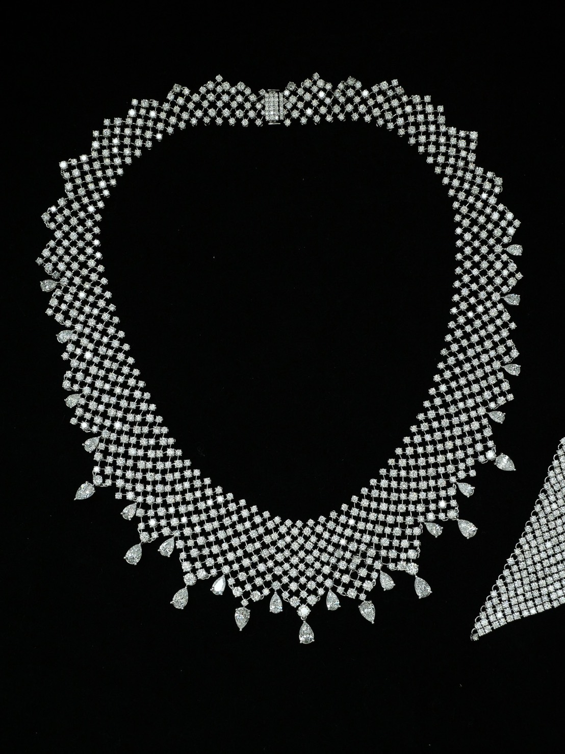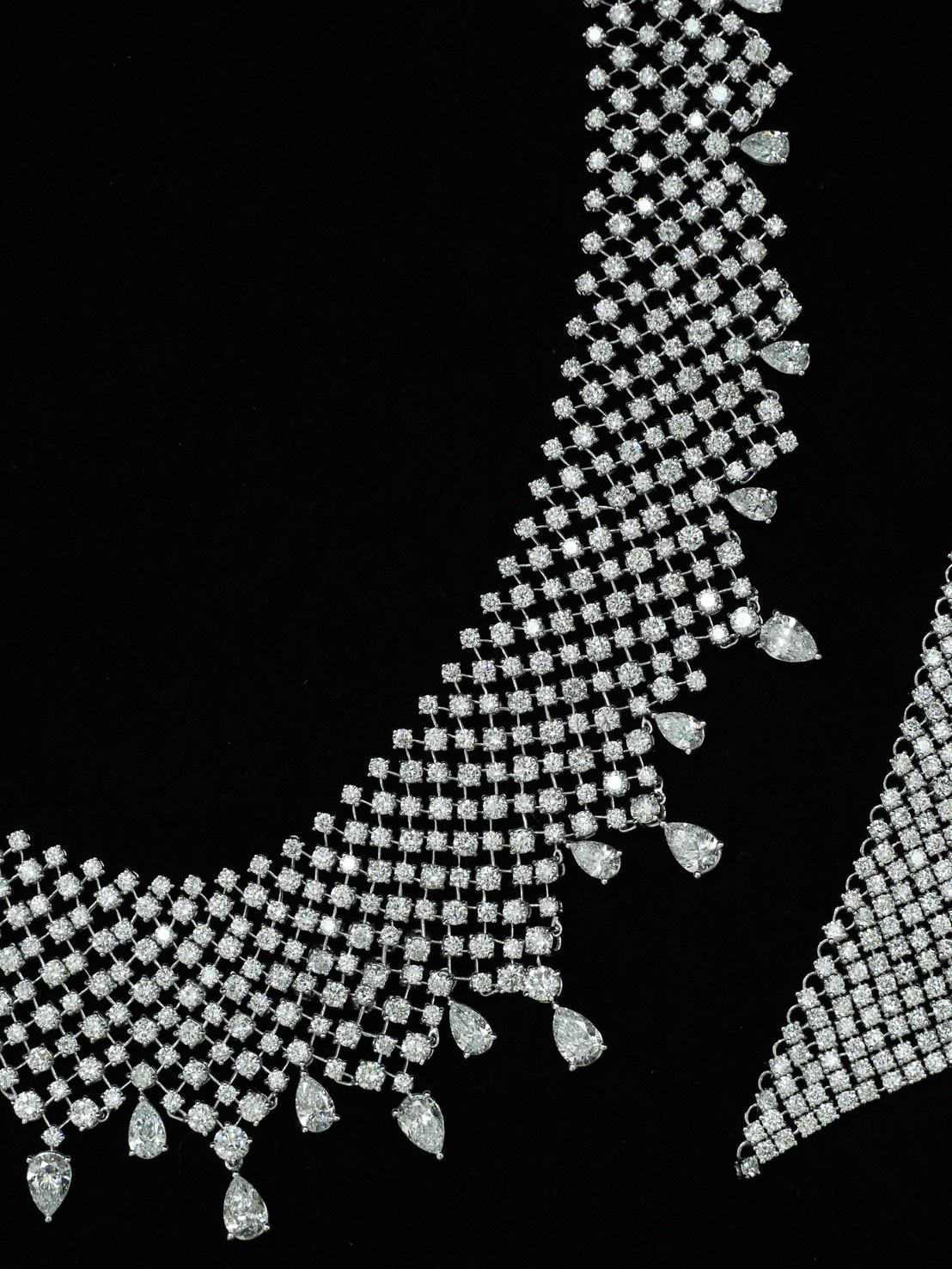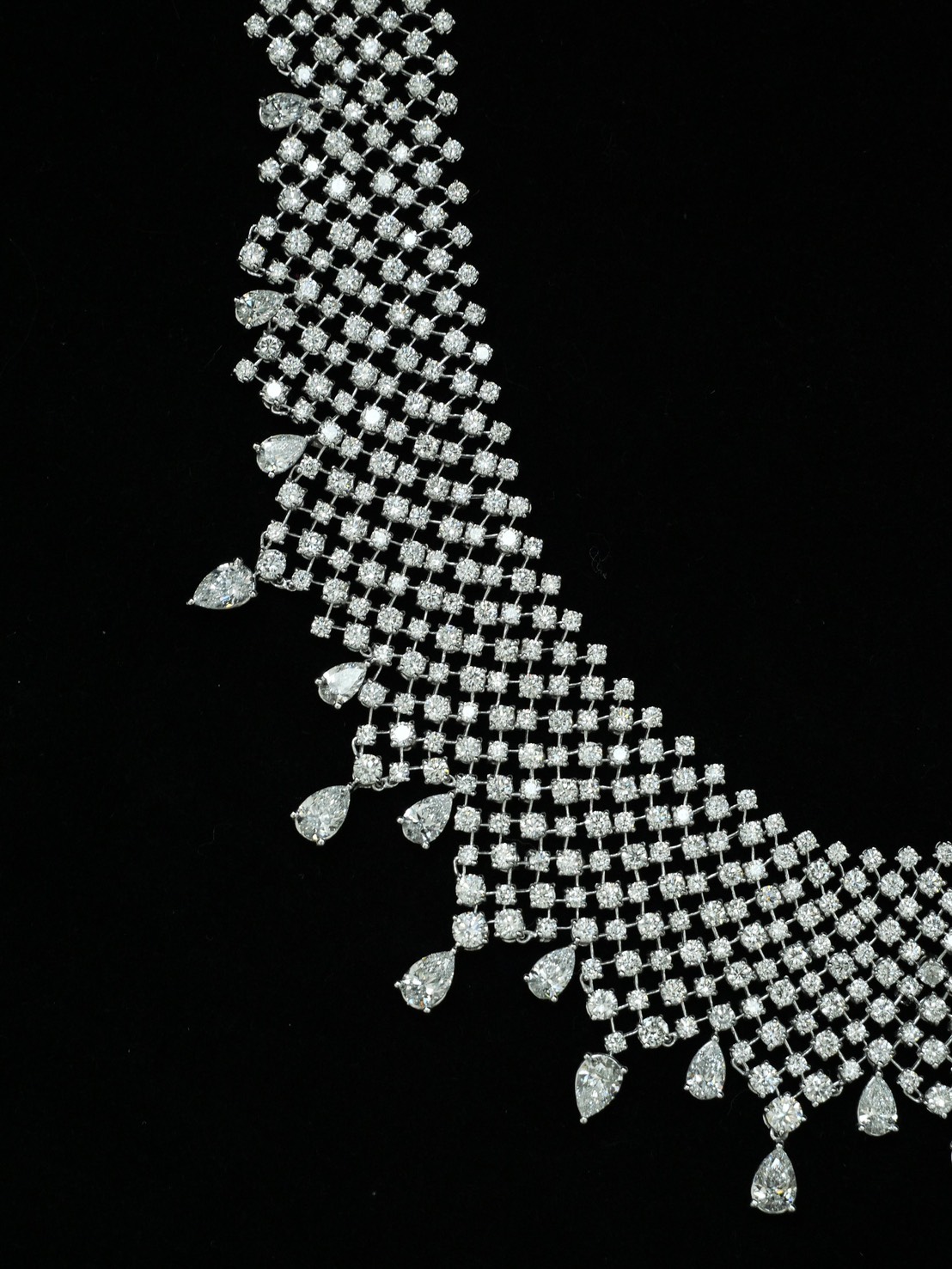 สร้อยคอเพชร Round 26.81 ct / 813 pcs Pear 6.80 ct / 25 pcs white gold 18k. 57.60 g. สี F G ความสะอาด VVS VS GIL ราคาเต็ม 5,590,000 บาท ราคาขาย 1,950,000 บาท