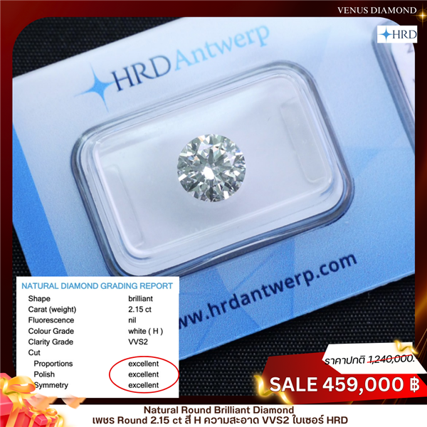 เพชร Round 2.15 ct สี H ความสะอาด VVS2 ใบเซอร์ HRD