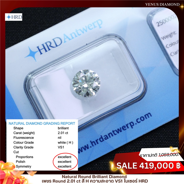 เพชร Round 2.01 ct สี H ความสะอาด VS1 ใบเซอร์ HRD