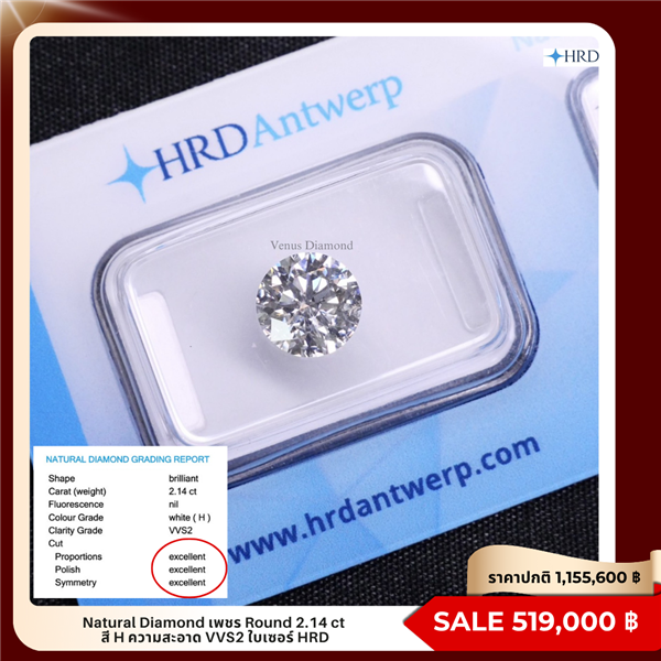 เพชร Round 2.14 ct สี H ความสะอาด VVS2 ใบเซอร์ HRD