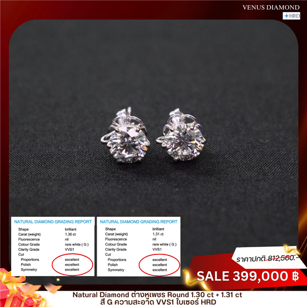 ต่างหูเพชร Round 1.30 ct + 1.31 ct สี G ความสะอาด VVS1 ใบเซอร์ HRD