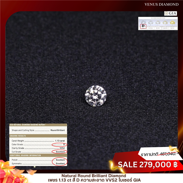 เพชร Round 1.13 ct สี D ความสะอาด VVS2 ใบเซอร์ GIA