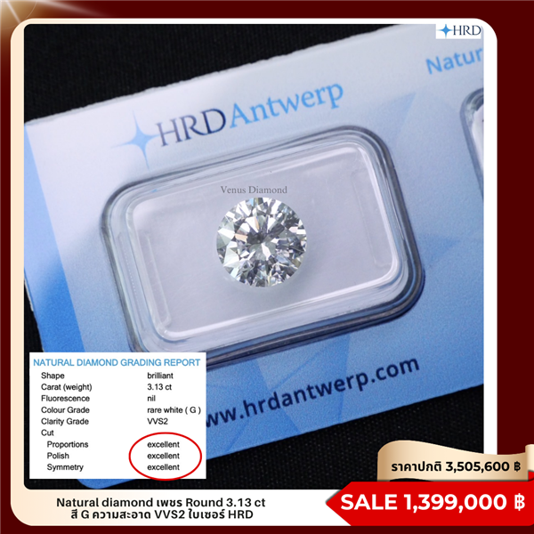 เพชร Round 3.13 ct สี G ความสะอาด VVS2 ใบเซอร์ HRD