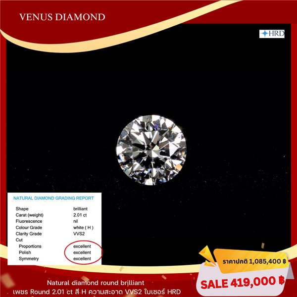 เพชร Round 2.01 ct สี H ความสะอาด VVS2 ใบเซอร์ HRD