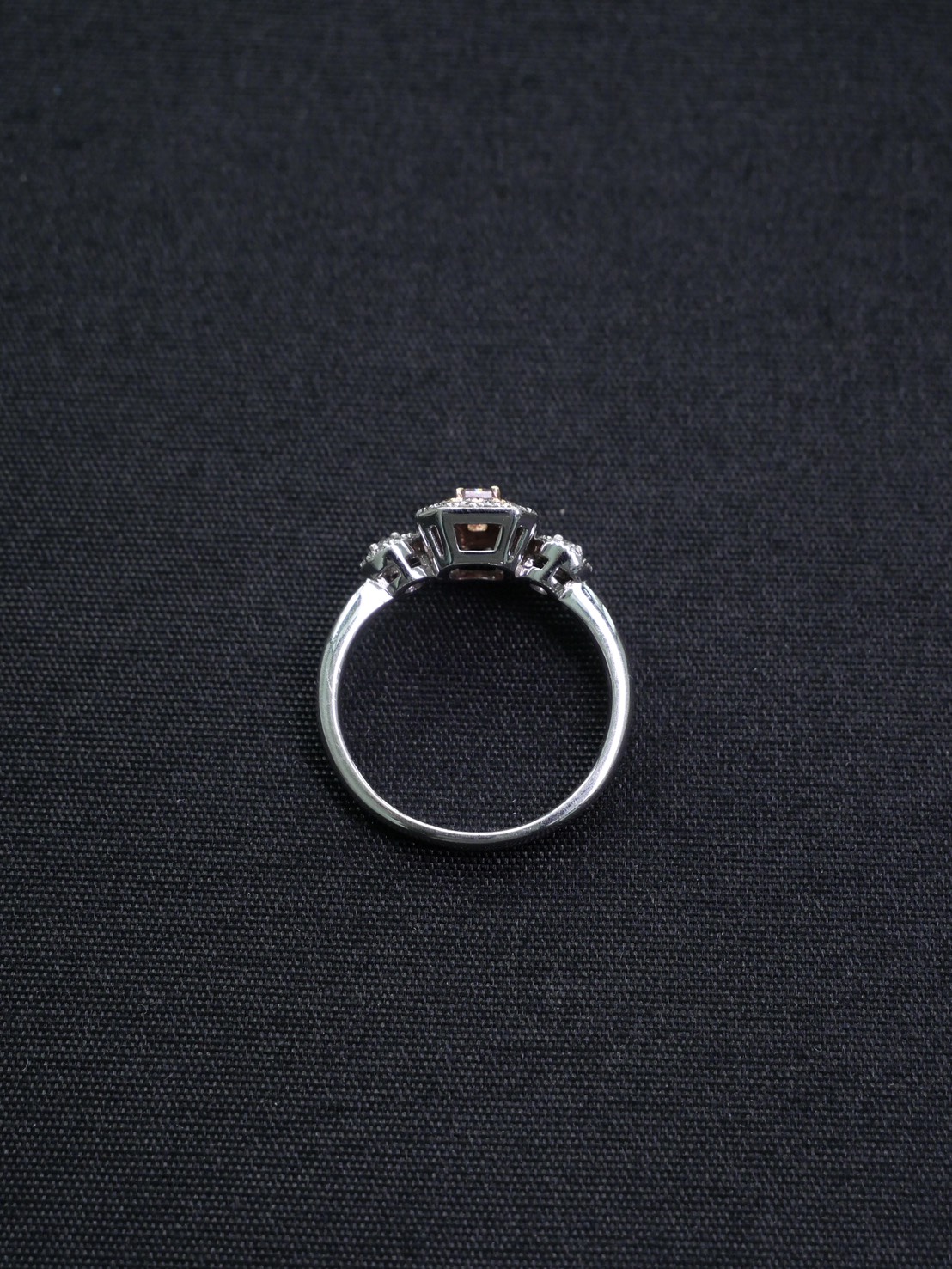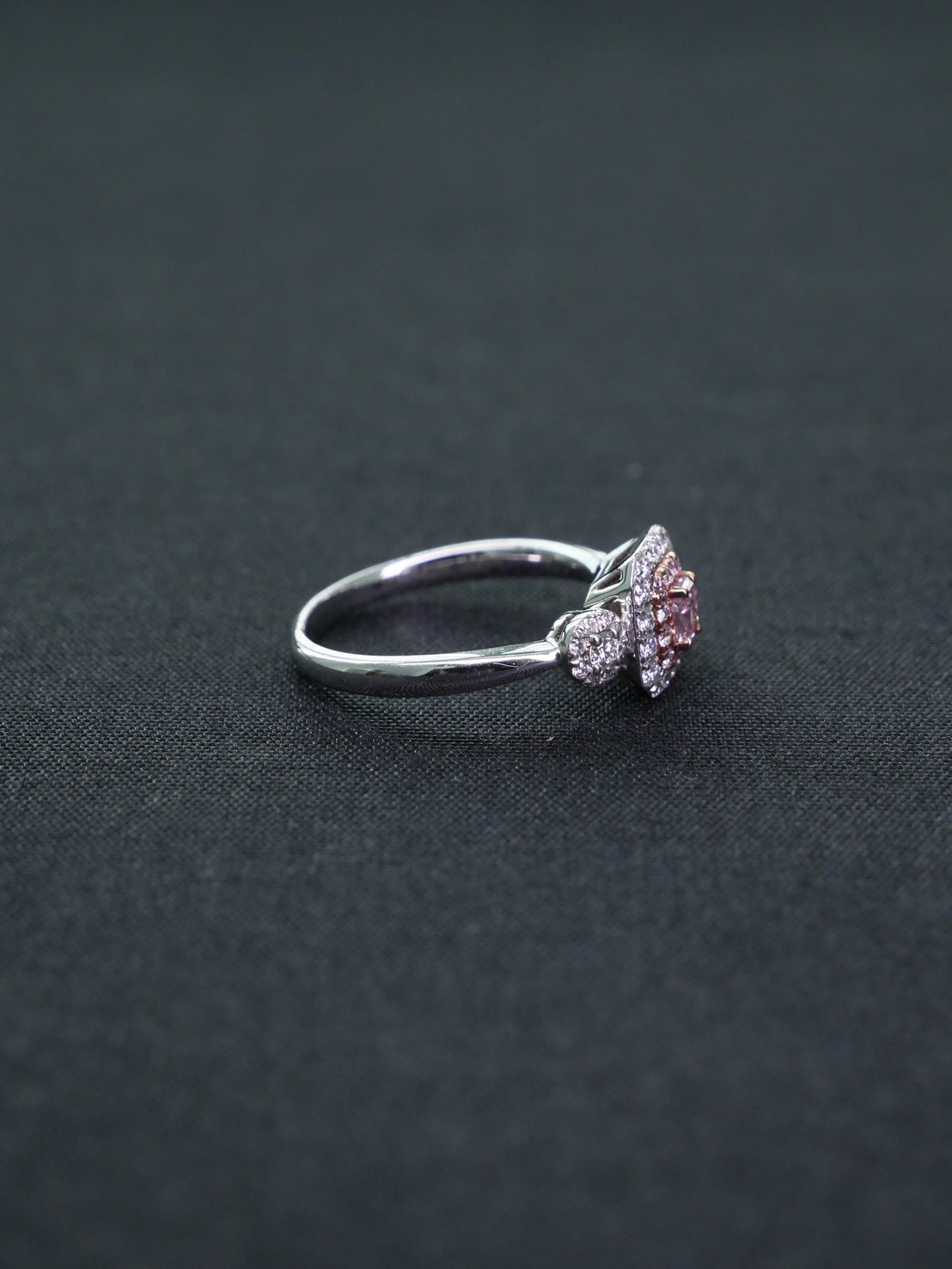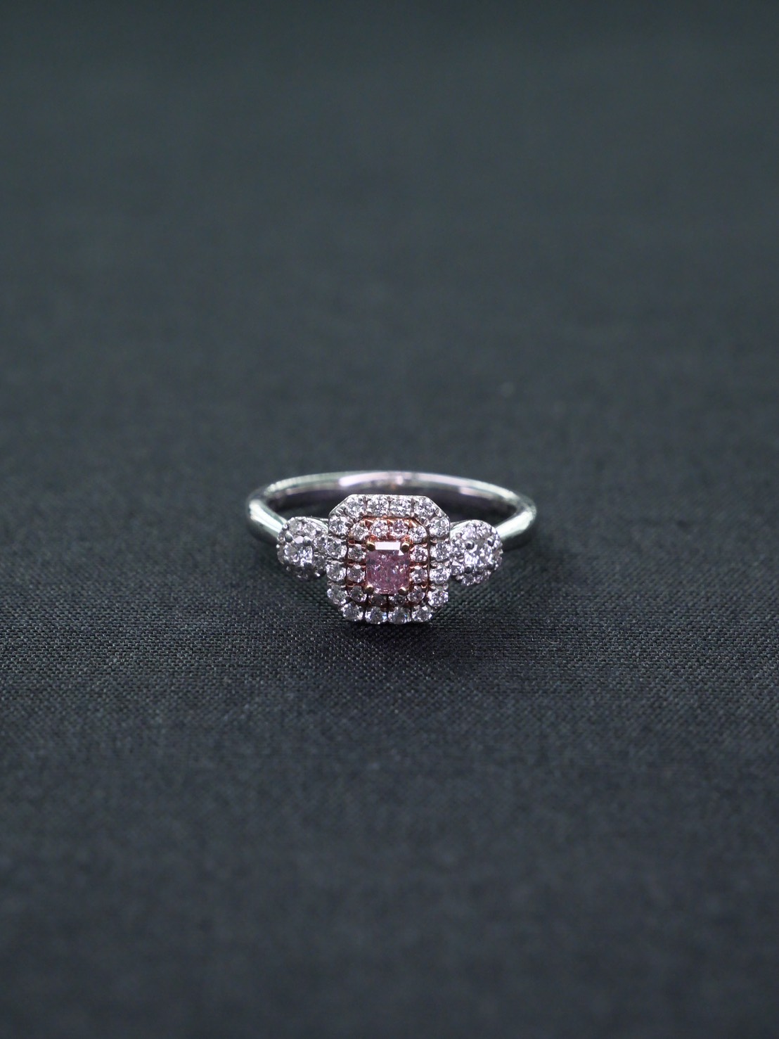 แหวนเพชร Radiant 0.18 ct Fancy Purplish Pink I2 1X1G N GIA 2195594227 Round 0.39 ct white gold 18k. 4.27 g.