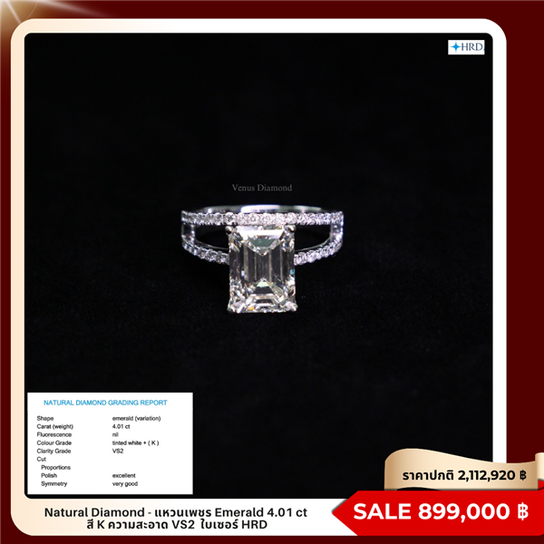 แหวนเพชร Emerald 4.01 ct สี K ความสะอาด VS2 ใบเซอร์ HRD