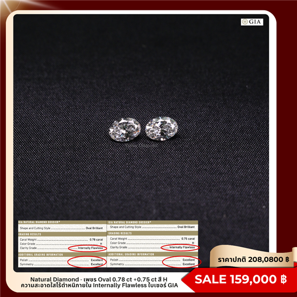 เพชร Oval 0.78 ct +0.75 ct สี H ความสะอาด Internally Flawless ใบเซอร์ GIA