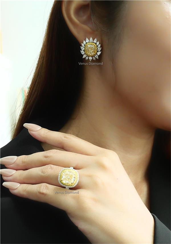 แหวนเพชร Cushion 6.02 ct ต่างหู Cushion 4.02 ct + 4.02 ct Fancy Intense ...