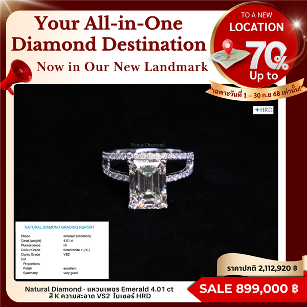แหวนเพชร Emerald 4.01 ct สี K ความสะอาด VS2 ใบเซอร์ HRD