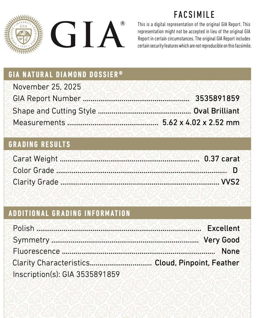 4) Oval 0.37 ct D VVS2 1X1VG N GIA 3535891859 ราคาเต็ม 31,080 บาท ราคาขาย 21,000 บาท