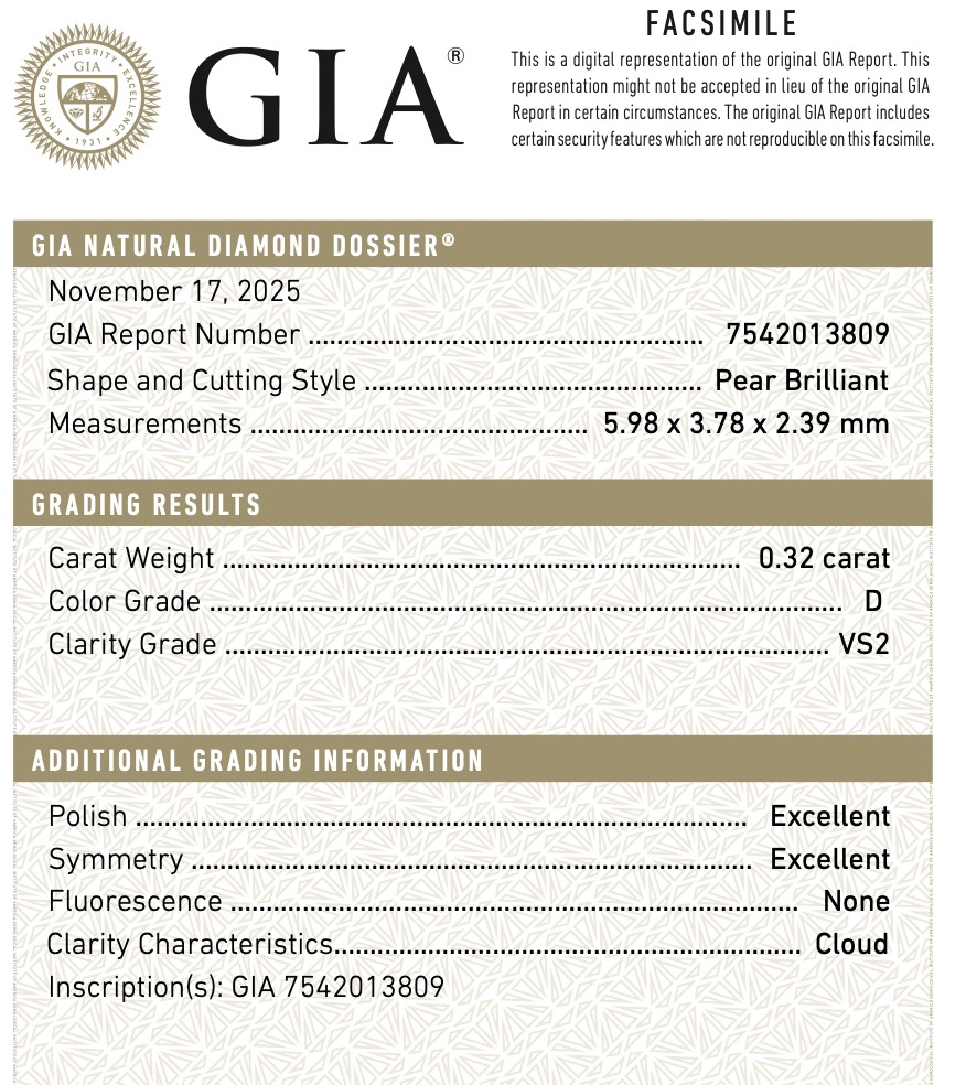 15) Pear 0.32 ct D VS2 2X N GIA 7542013809 ราคาเต็ม 23,040 บาท ราคาขาย 16,000 บาท
