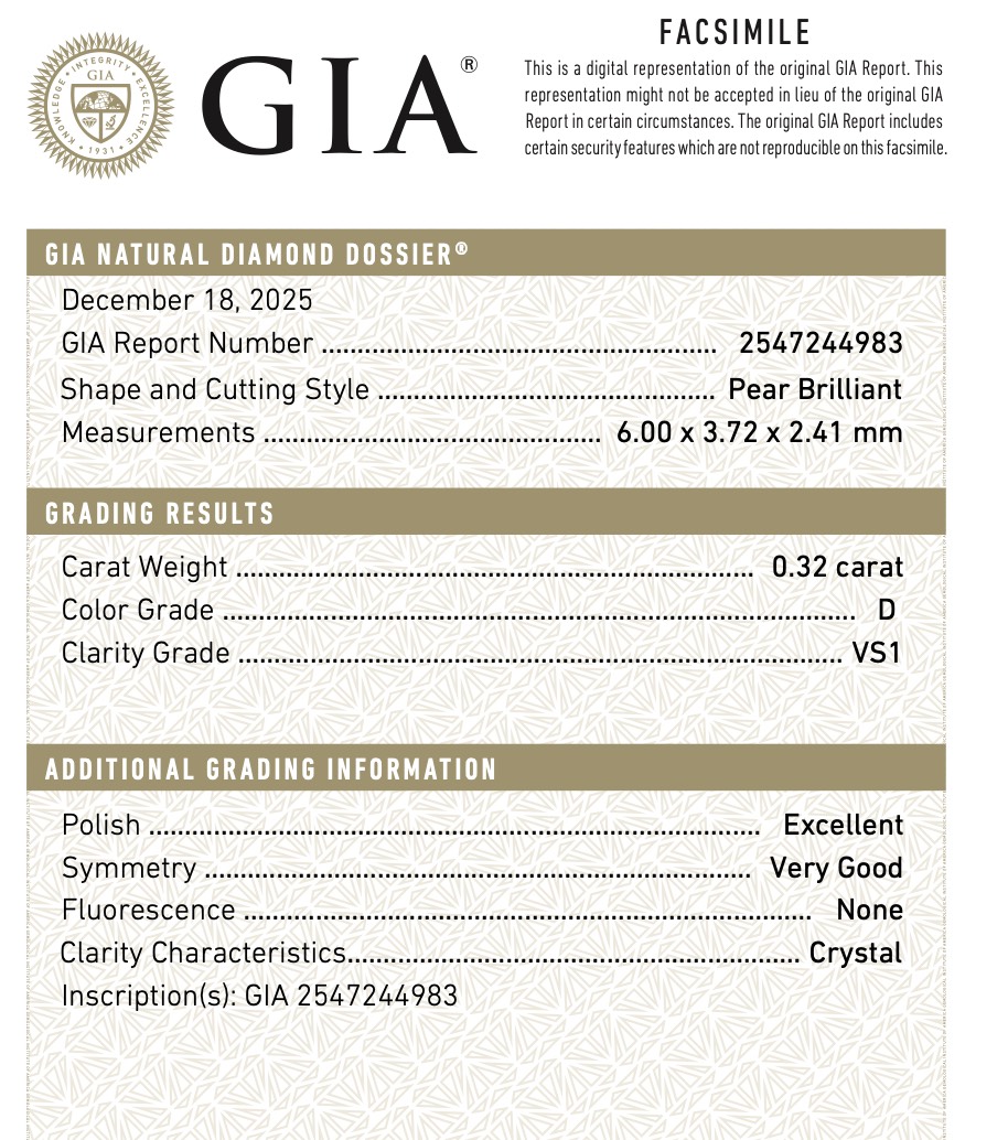 13) Pear 0.32 ct D VS1 1X1VG N GIA 2547244983 ราคาเต็ม 24,320 บาท ราคาขาย 17,000 บาท