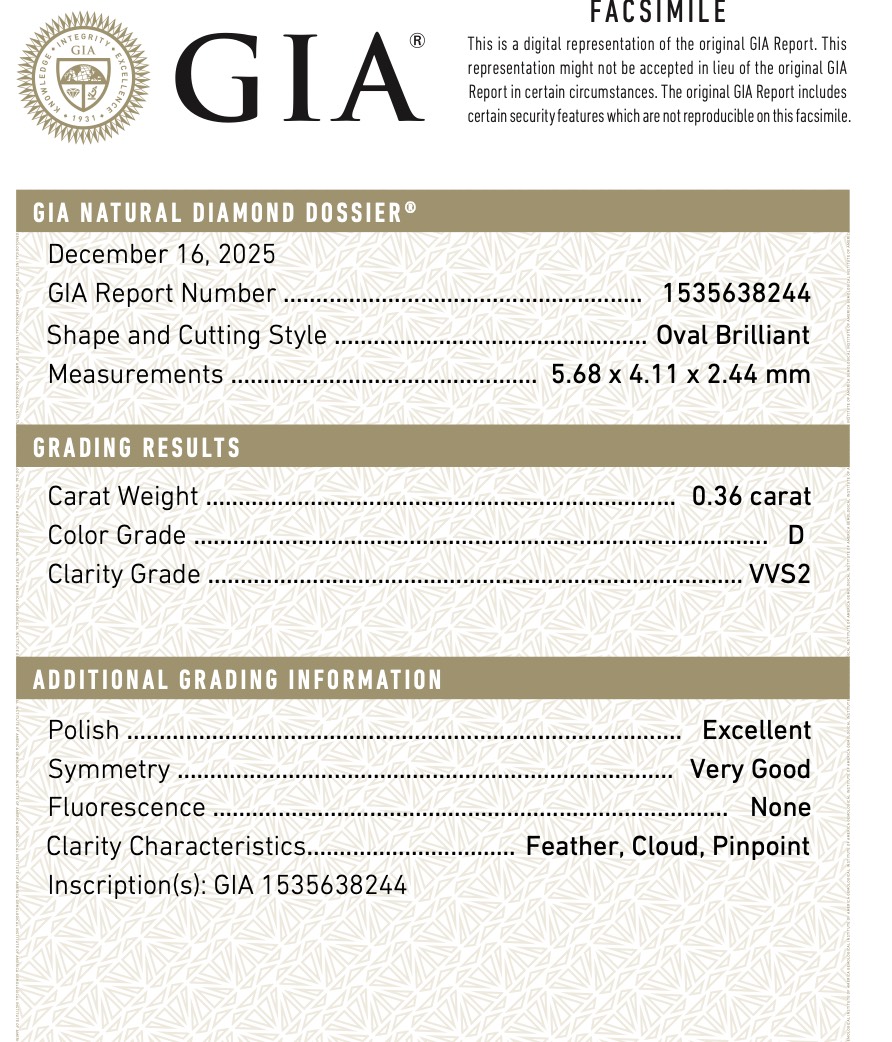 3) Oval 0.36 ct D VVS2 1X1VG N GIA 1535638244 ราคาเต็ม 30,240 บาท ราคาขาย 20,000 บาท