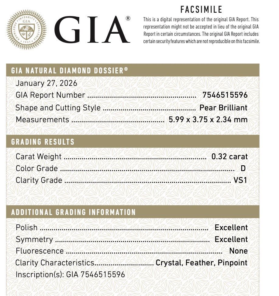 17) Pear 0.32 ct D VS1 2X N GIA 7546515596 ราคาเต็ม 24,320 บาท ราคาขาย 17,000 บาท