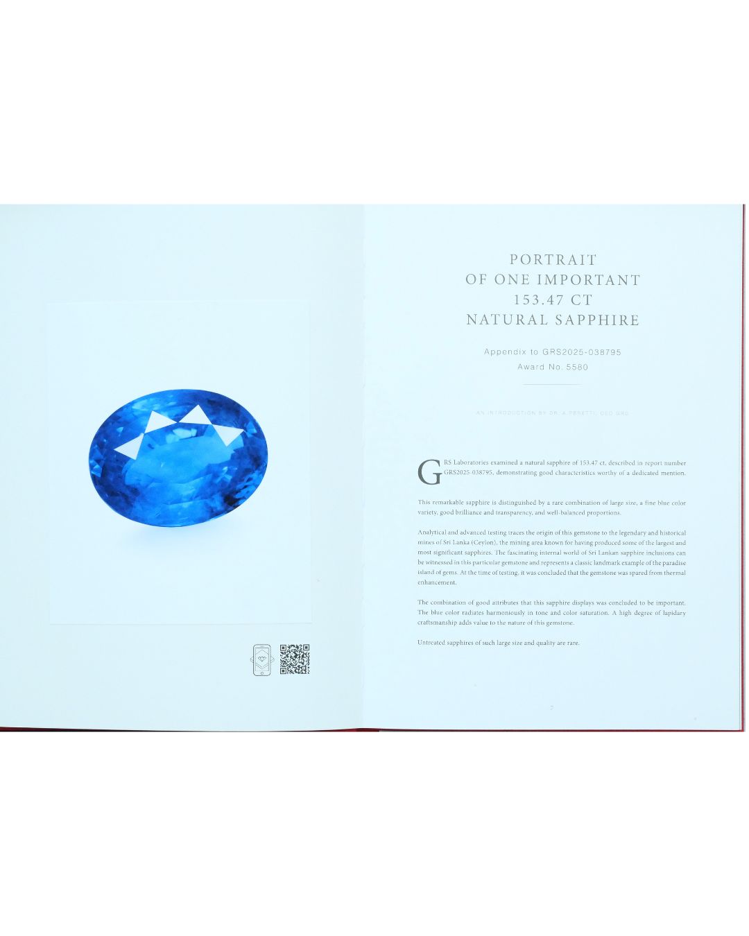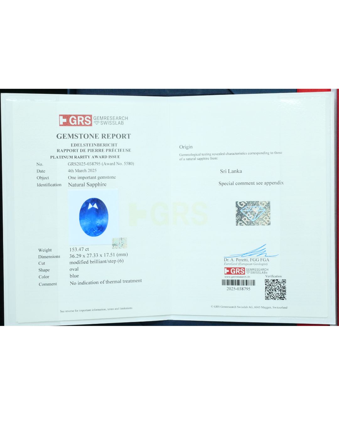 Sapphire 153.47 ct GRS2025-038795 (Award No.5580) OVAL blue No indication of thermal treatment Sri Lanka