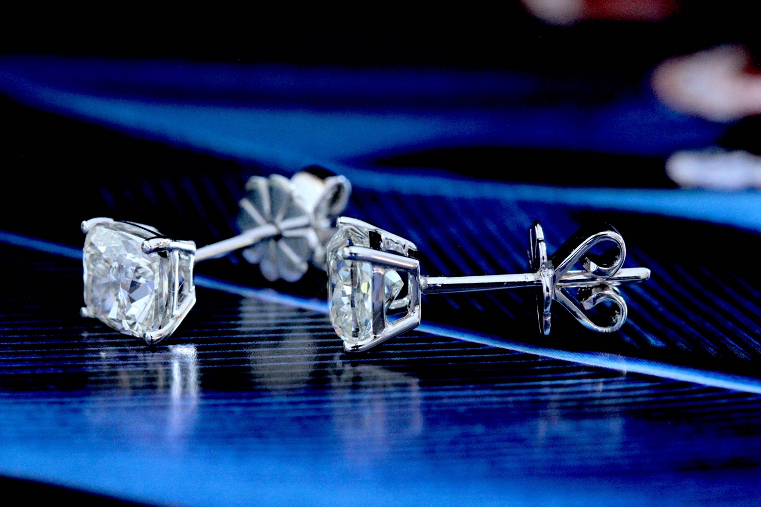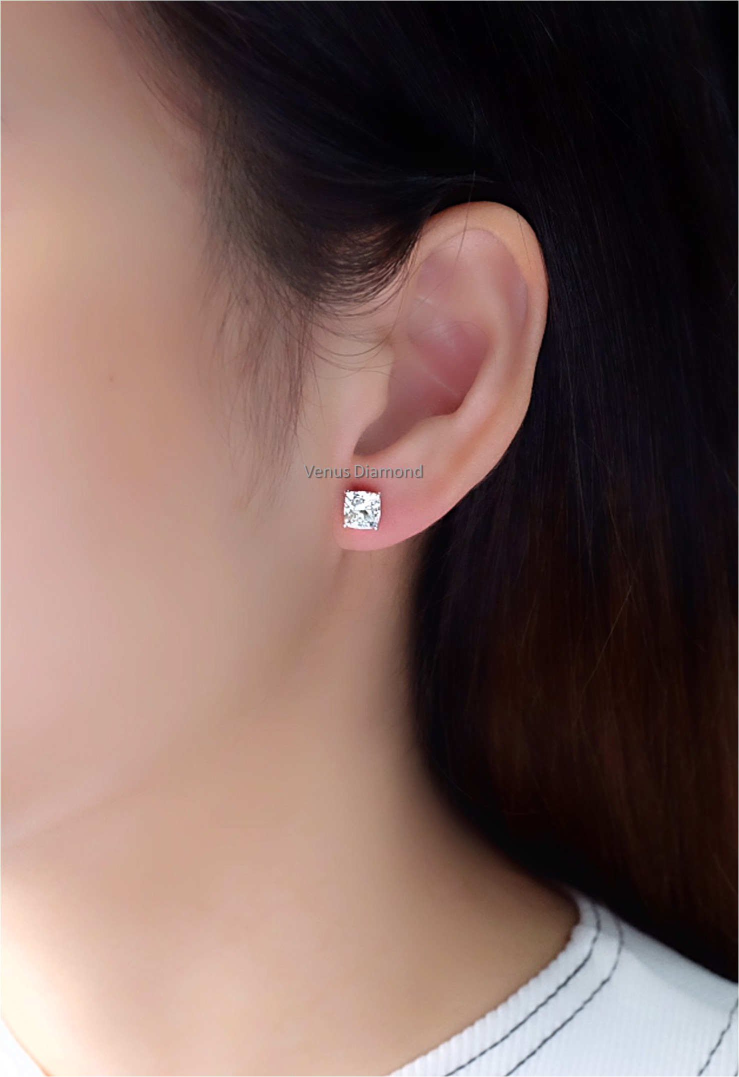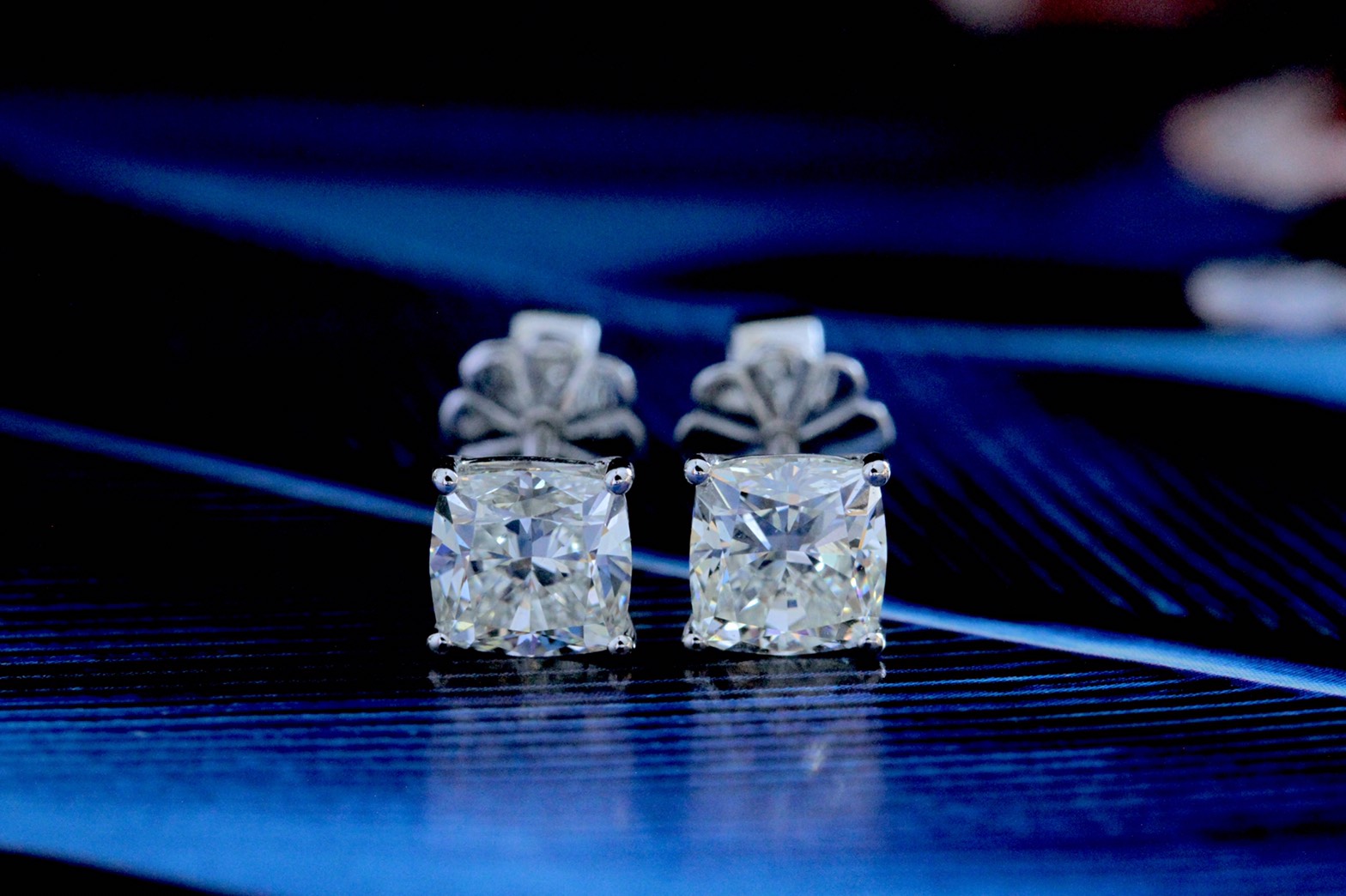 ต่างหูเพชร Cushion 1.20 กะรัต และ 1.20 กะรัต สี I-J เพชรสะอาดมาก VS2 เจียระไนดี เล่นไฟดี ไม่ติดฟลู