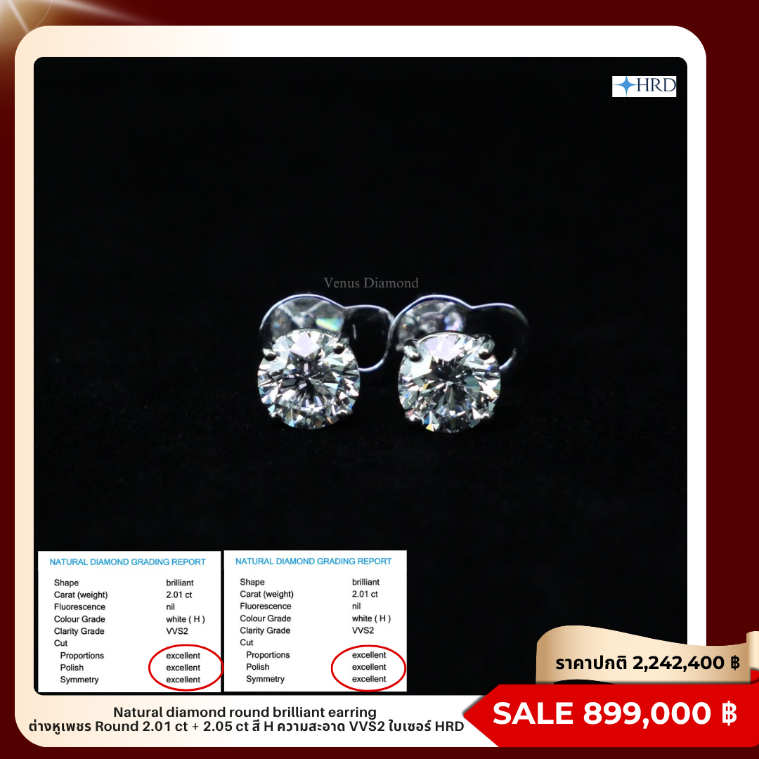 ต่างหูเพชร Round 2.01 + 2.05 ct