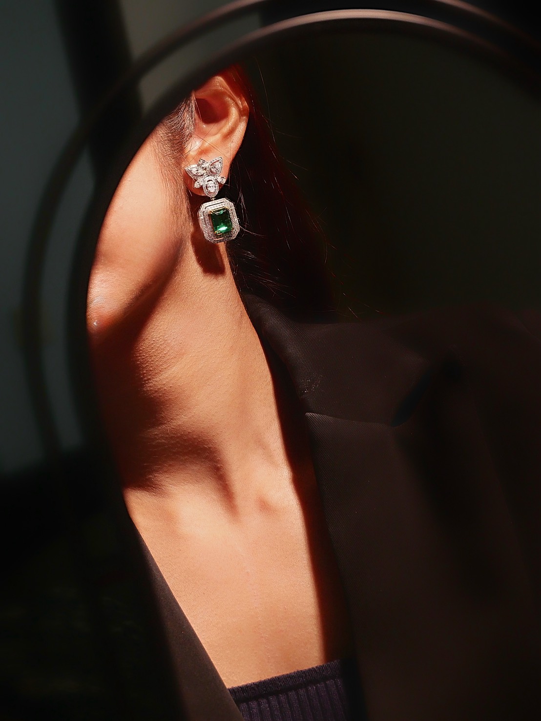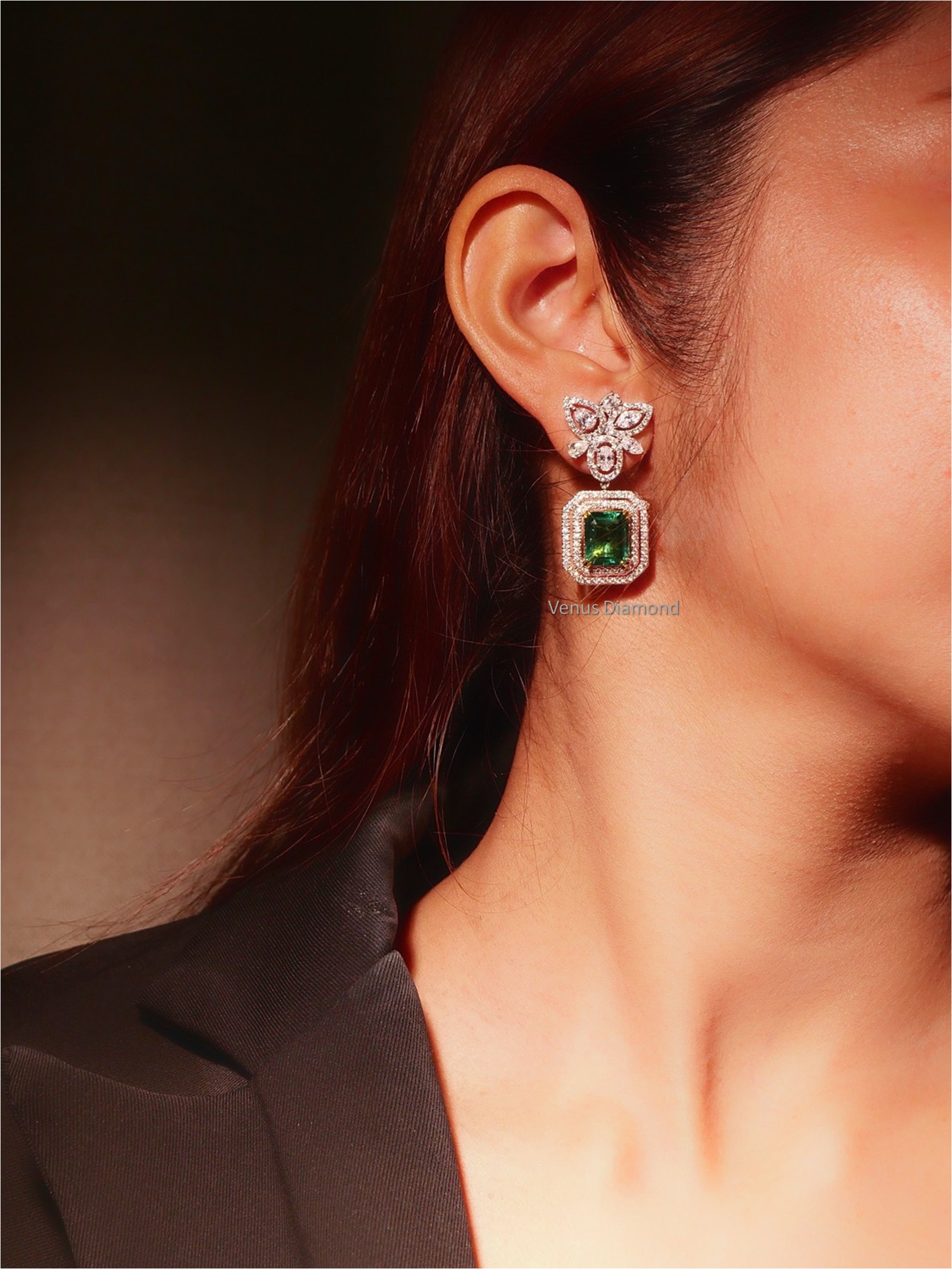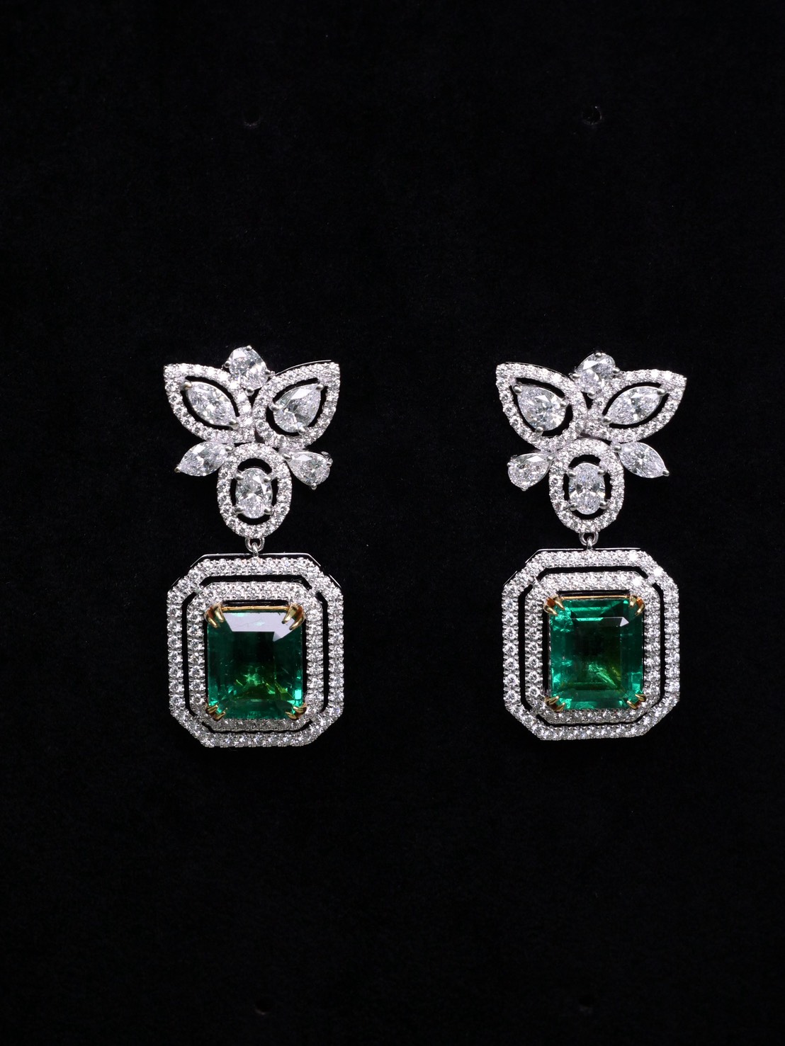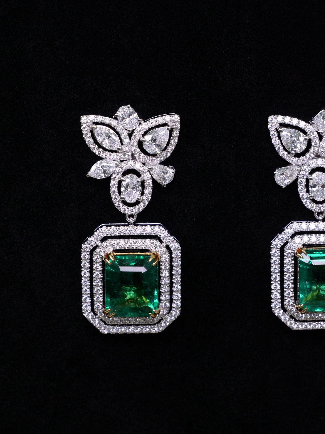 ต่างหู มรกต 4.45 ct + 4.67 ct แซมเบีย ใบเซอร์ GRS Fancy 12 pcs 2.28 ct Round 252 pcs 1.90 ct สี E F ความสะอาด VVS VS white gold 18k. 19.34 g