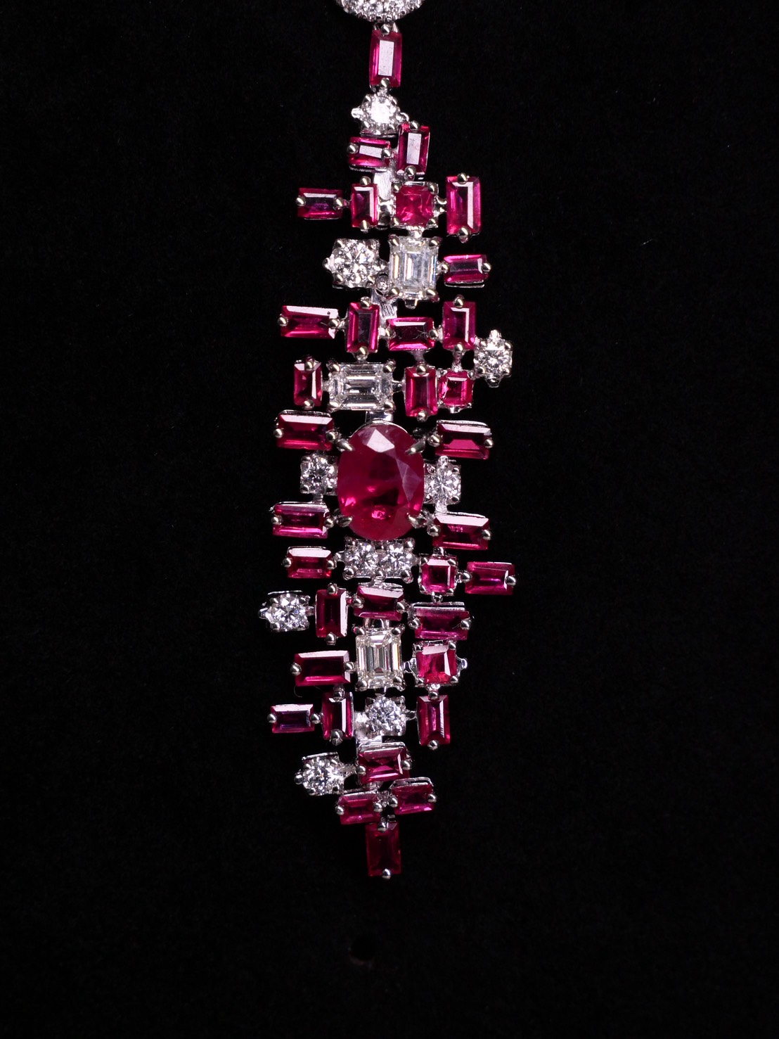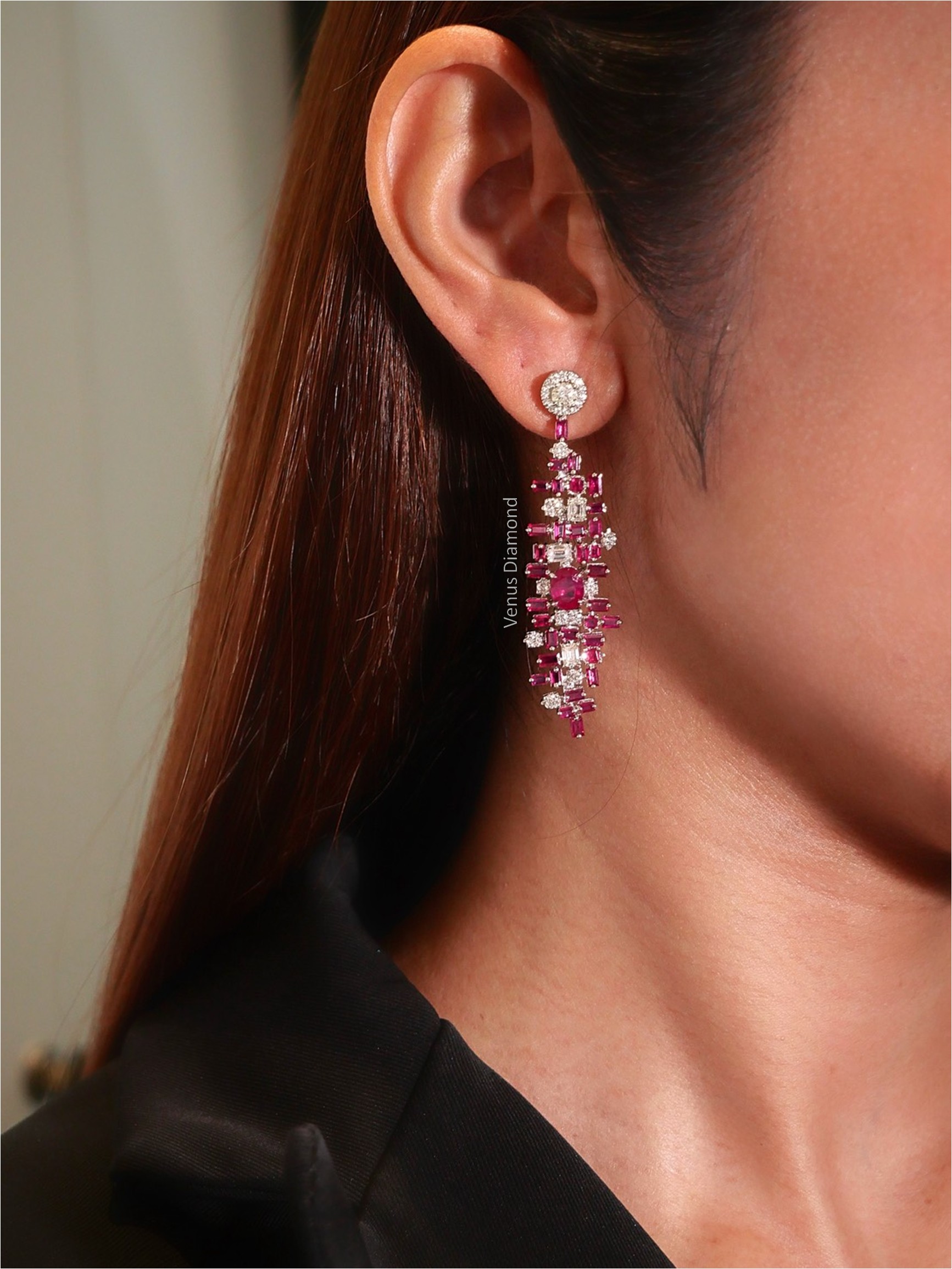 ต่างหู Ruby 2 pcs 1.99 ct Ruby Fancy 68 pcs 4.49 ct Emerald 6 pcs 1.11 ct Round 2 pcs 0.51 ct Round 48 pcs 0.84 ct สี F G ความสะอาด VVS white gold 18k. 14.42 g.