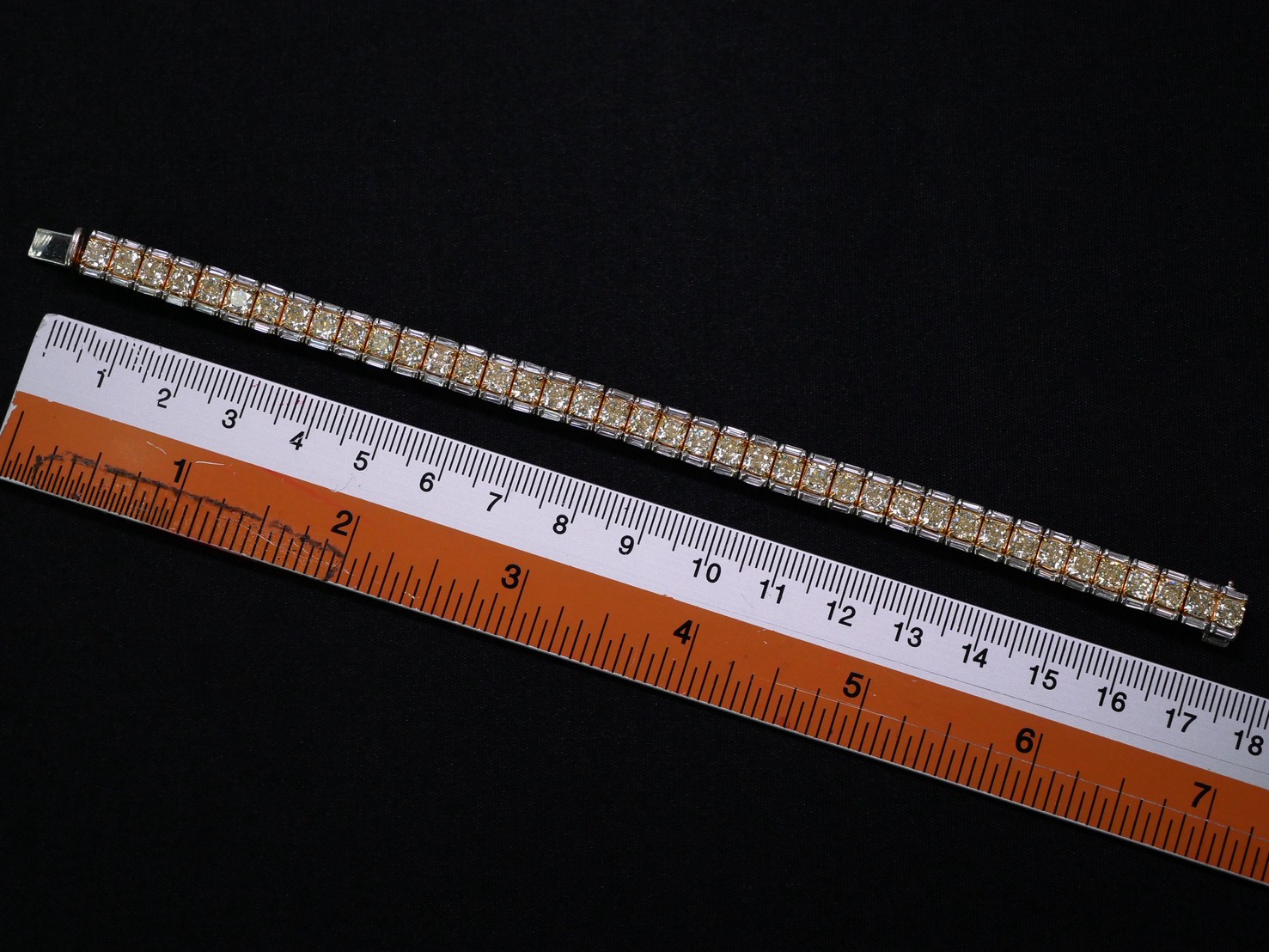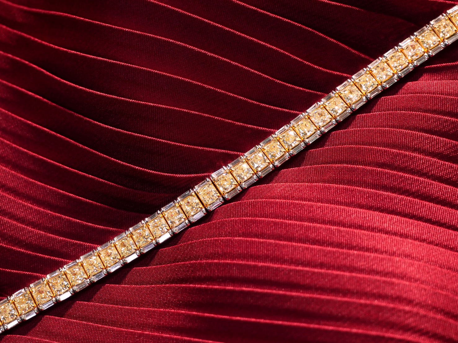 สร้อยข้อมือเพชร Radiant 40 pcs 12.02 ct Fancy Yellow GIL Baguette 80 pcs 1.88 ct สี E ความสะอาด VVS VS GIL