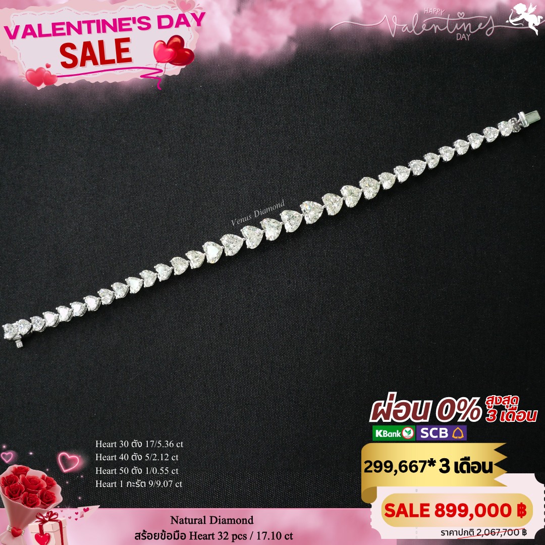 สร้อยข้อมือ Heart 30 ตัง 17/5.36 ct Heart 40 ตัง 5/2.12 ct Heart 50 ตัง 1/0.55 ct Heart 1 กะรัต 9/9.07 ct