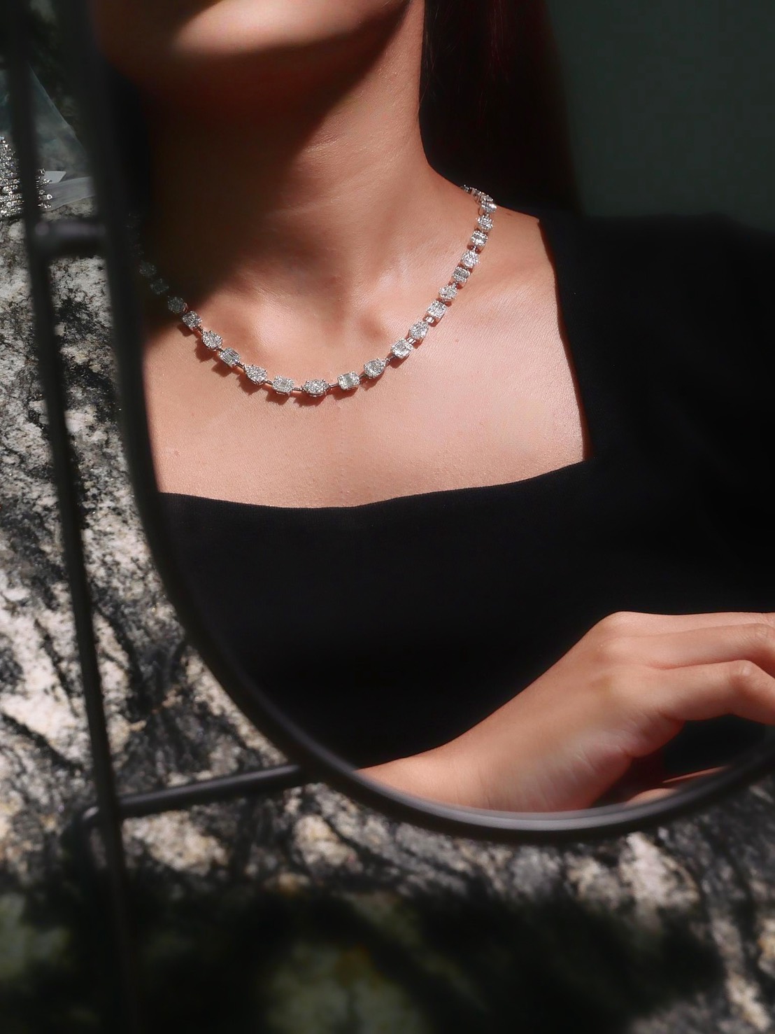 สร้อยคอ N1563A1/133613 Baguette 40 / 1.030 ct Baguette 80 / 2.339 ct Marquise 2 / 0.240 ct Marquise 57 / 4.185 ct Pear 19 / 1.640 ct Princess 21 / 1.233 ct Round 80 / 0.890 ct white gold 18k. 28.48 g.