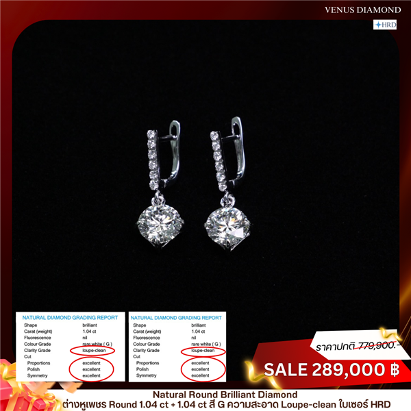 ต่างหูเพชร Round 1.04 ct + 1.04 ct สี G ความสะอาด Loupe-clean ใบเซอร์ HRD
