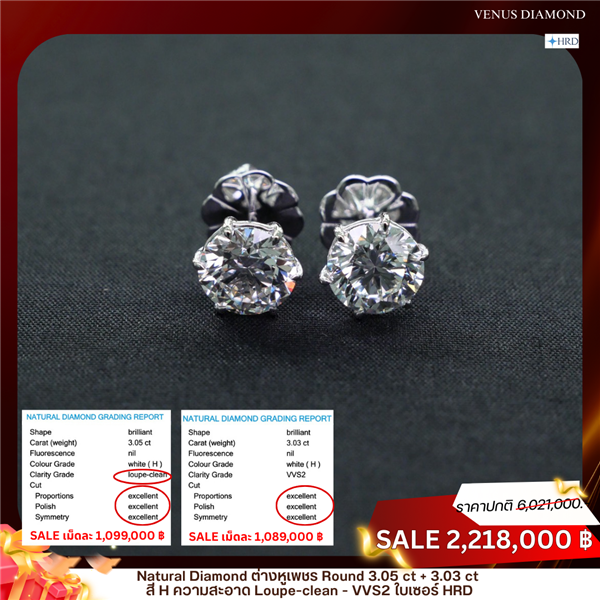 ต่างหูเพชร Round 3.05 ct + 3.03 ct สี H ความสะอาด LC-VVS2 ใบเซอร์ HRD