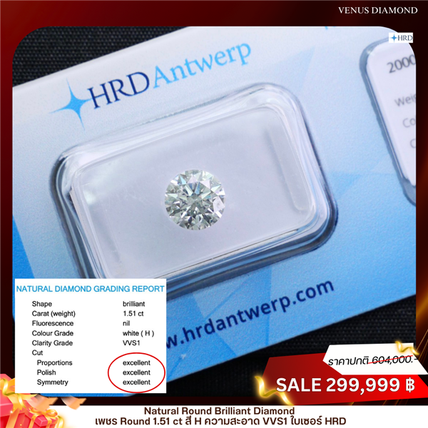 เพชร Round 1.51 ct สี H ความสะอาด VVS1 ใบเซอร์ HRD