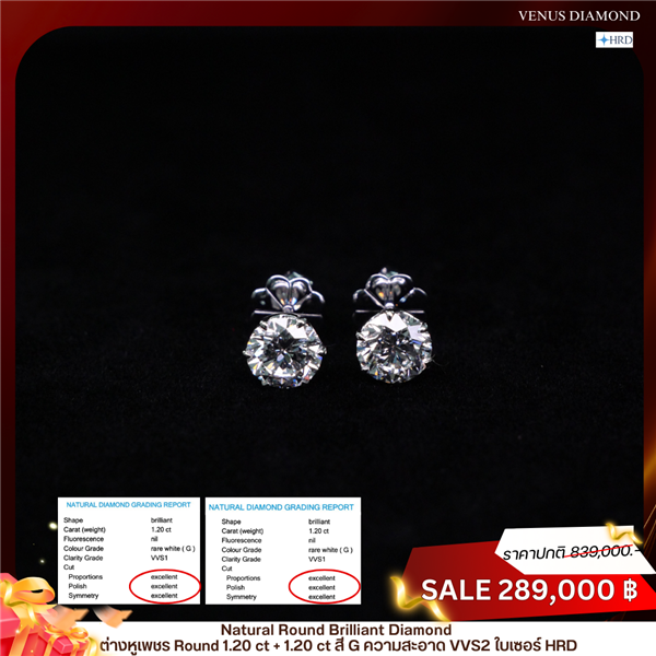 ต่างหูเพชร Round 1.20 ct + 1.20 ct สี G ความสะอาด VVS2 ใบเซอร์ HRD