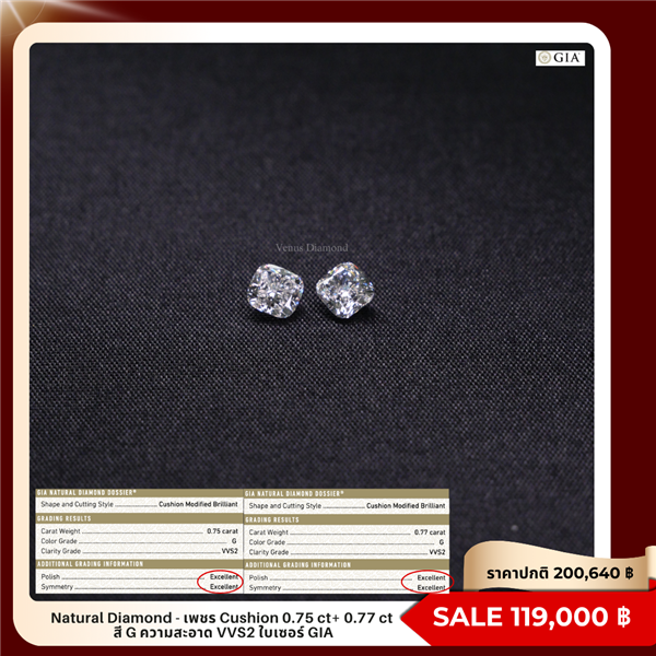 เพชร Cushion 0.75 ct+ 0.77 ct สี G ความสะอาด VVS2 ใบเซอร์ GIA