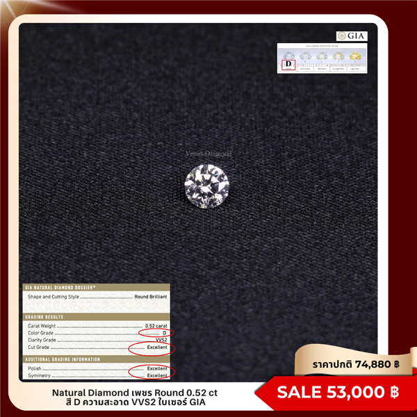 เพชร Round 0.52 ct สี D ความสะอาด VVS2 ใบเซอร์ GIA