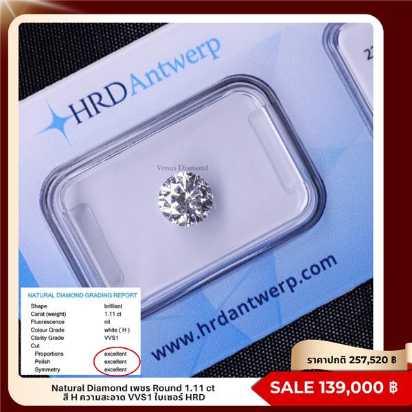 เพชร Round 1.11 ct สี H ความสะอาด VVS1 ใบเซอร์ HRD