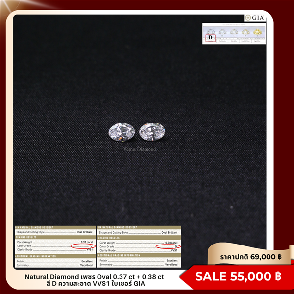 เพชร Oval 0.37 ct +0.38 ct สี D ความสะอาด VVS1 ใบเซอร์ GIA