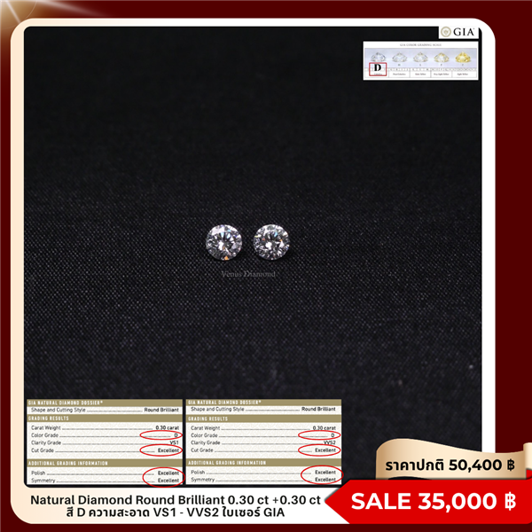 เพชร Round 0.30 ct + 0.30 ct สี D ความสะอาด VS1 - VVS2 ใบเซอร์ GIA